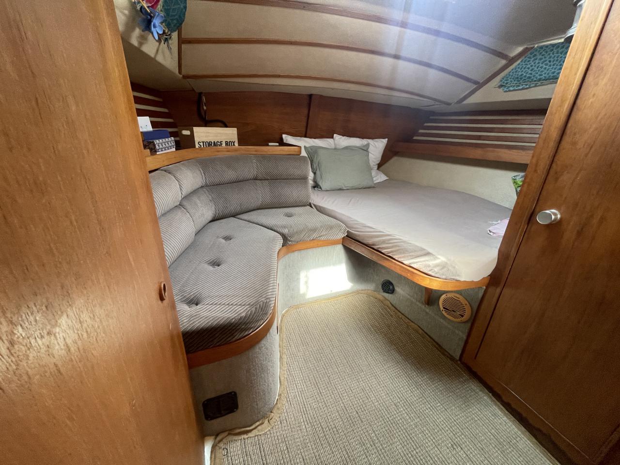 Cabine arrière lit double, banquette, penderie, petite commode