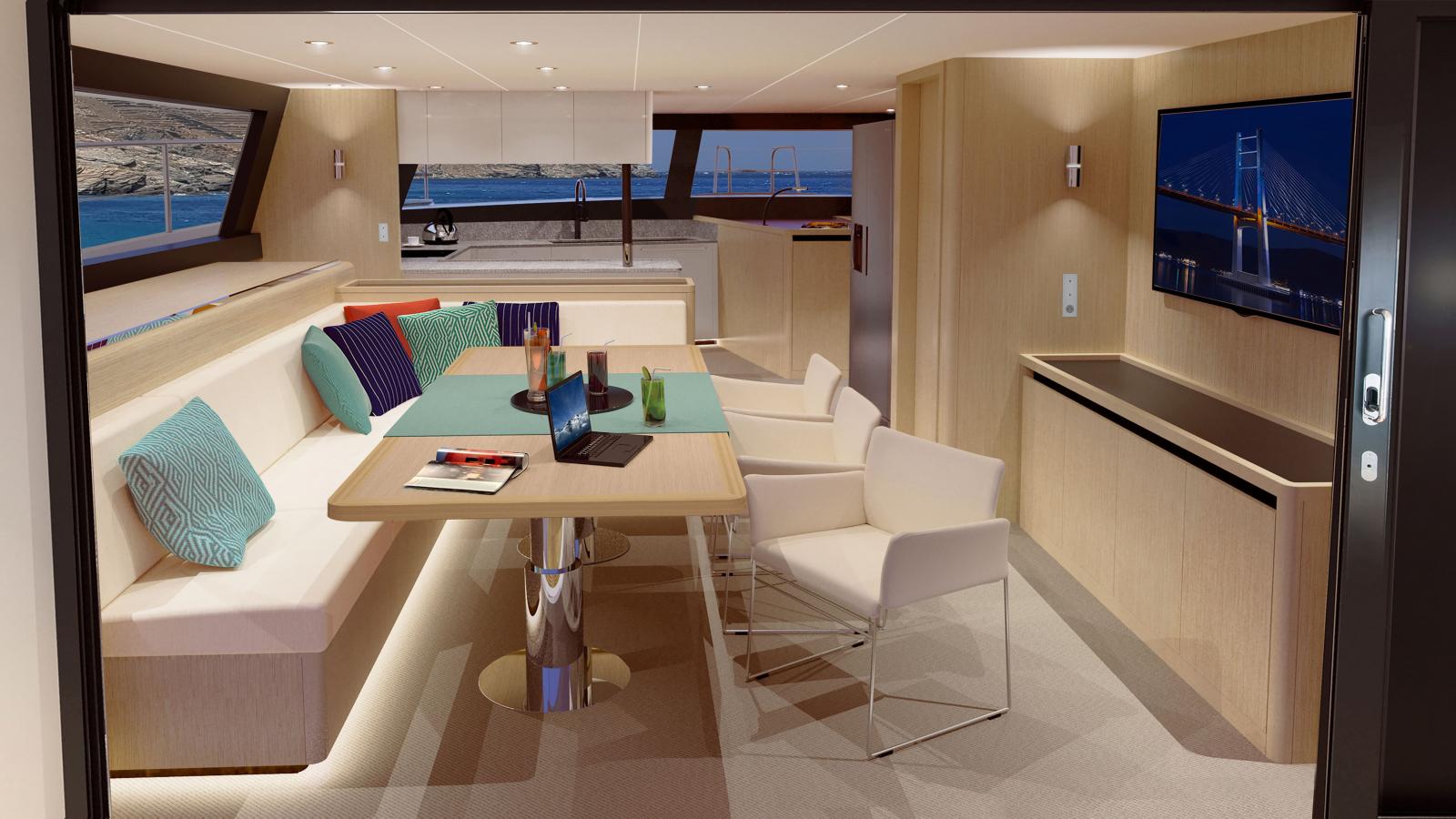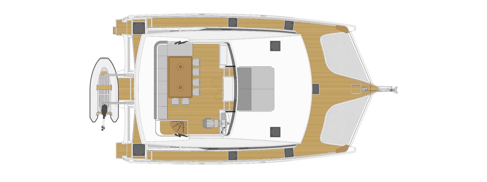 L'entretien est simplifié grâce à une cale technique spacieuse. Le flybridge propose un espace de plus de 20 m², avec des passavants larges pour la sécurité et des trampolines pour la détente. Le cockpit est spacieux avec une vue panoramique.