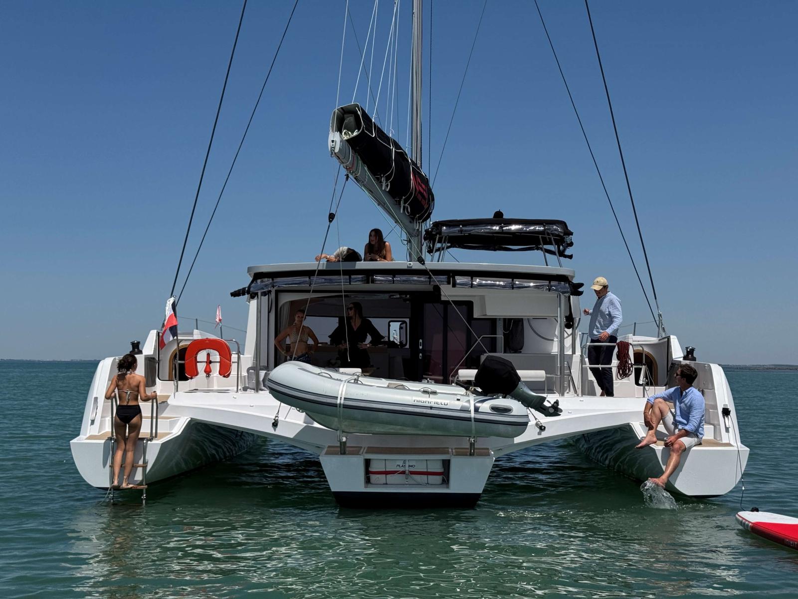 Jupe coque centrale • 2 marches d’accès à la mer • Echelle de bain supplémentaire avec douchette eau chaude/eau froide en option • Bers de réception de l’annexe • Emplacement pour le radeau de survie