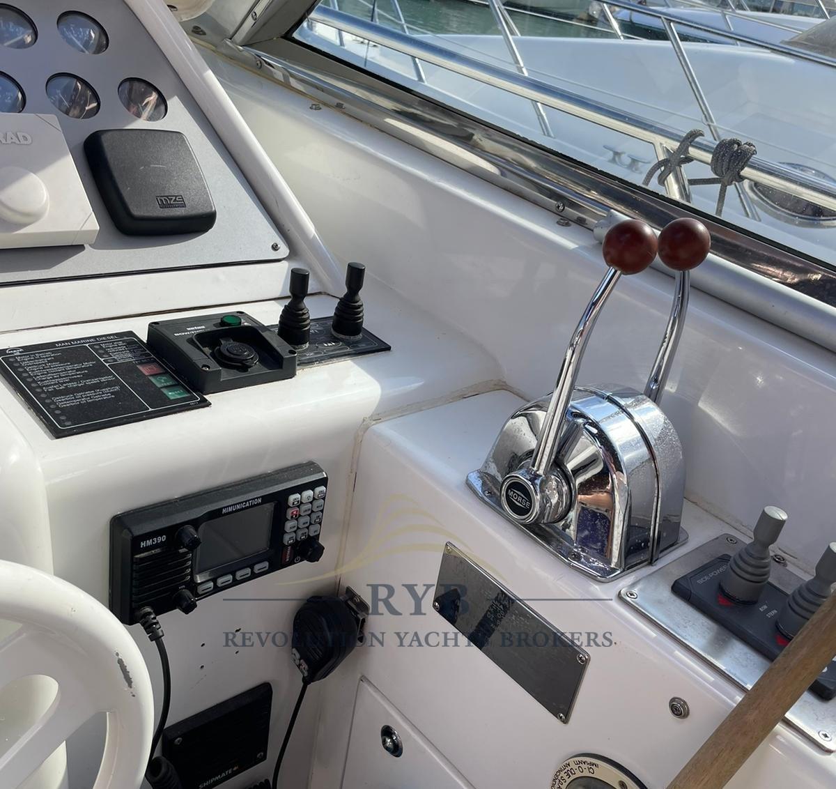 Eau sous pression, Batteries (NUOVE), Extincteur(s) fixe(s), Lavabo dans le cockpit, Éclairage de courtoisie (LED TUTTI AMBIENTI), Passerelle, Plateforme arrière, Pompe de cale électrique (NUOVE), Cockpit en teck, Prise de quai, Rollbar, Guindeau électrique, table de cockpit, Annexe (con mercruiser 20cv).