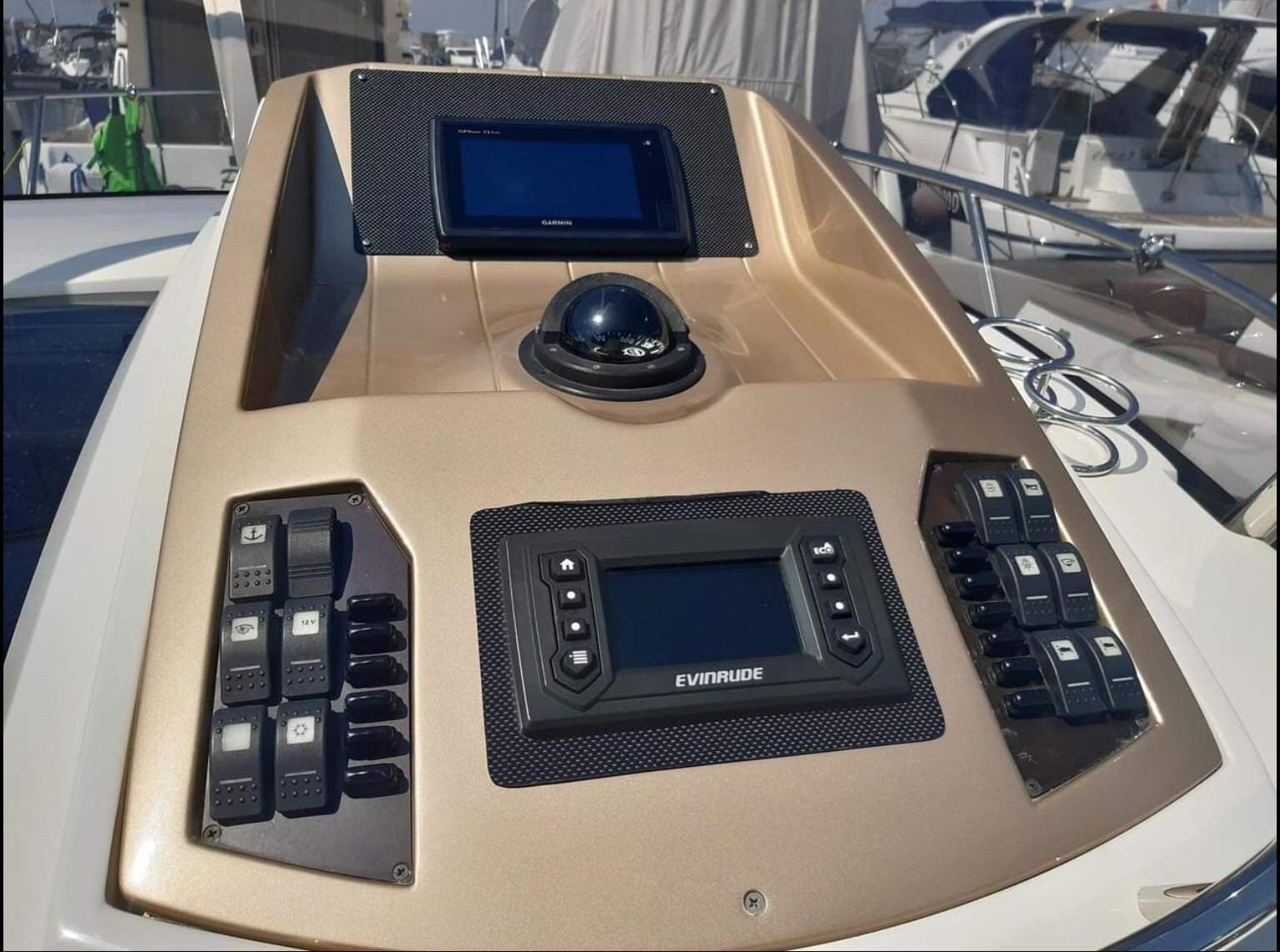 Alarme moteur, 3 Batteries, Passavant en teck, Couleur spéciale (blu verniciatura 2023), Douche de cockpit, Flaps hydrauliques, Indicateurs de flaps, Lavabo dans le cockpit, Passerelle, Plateforme arrière, Pompe de cale manuelle, Porte latérale, Cockpit en teck, Prise de quai, Connexion eau sous pression à quai, Guindeau électrique, Echelle de bain, table de cockpit, Annexe, Corne.