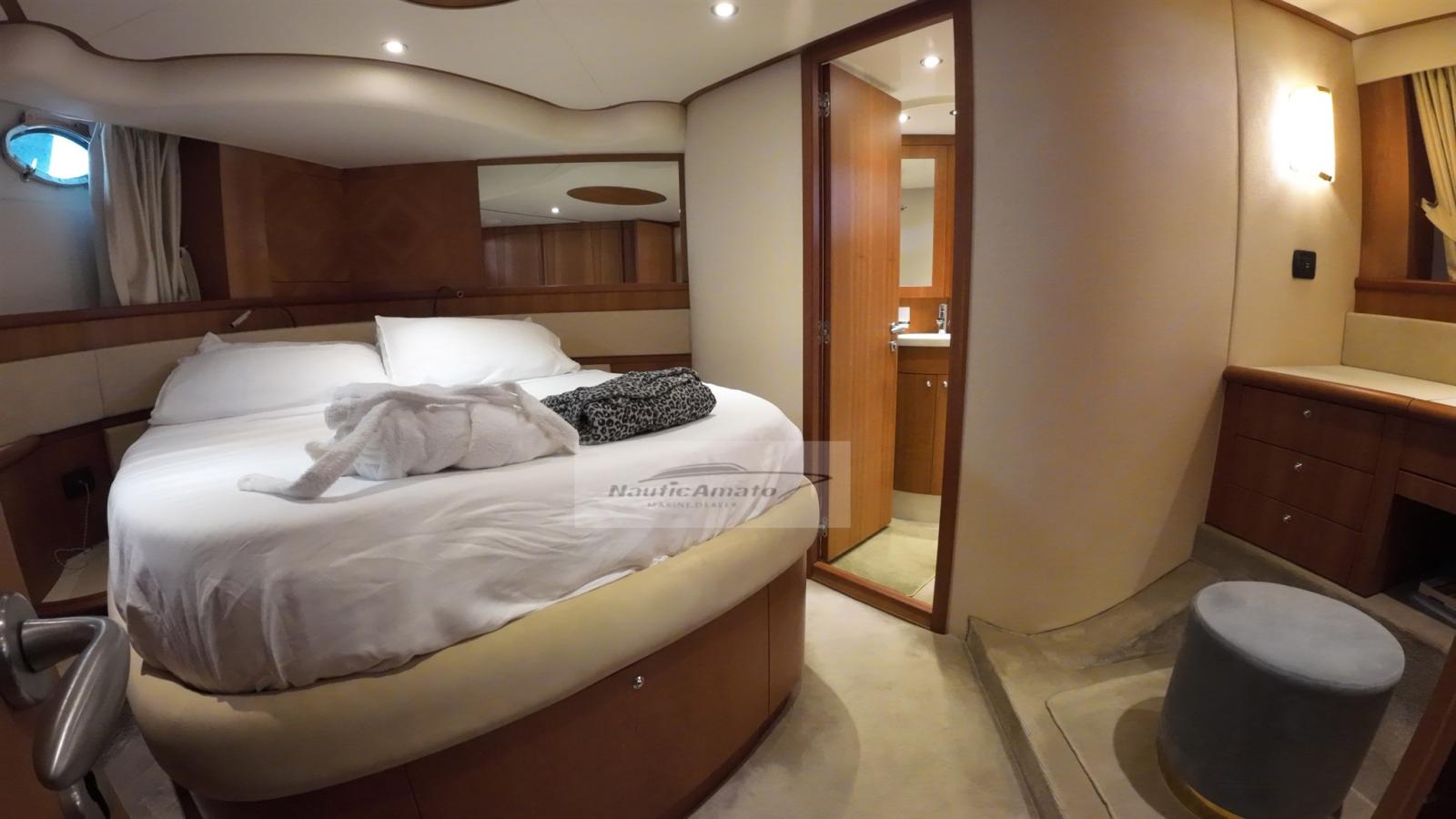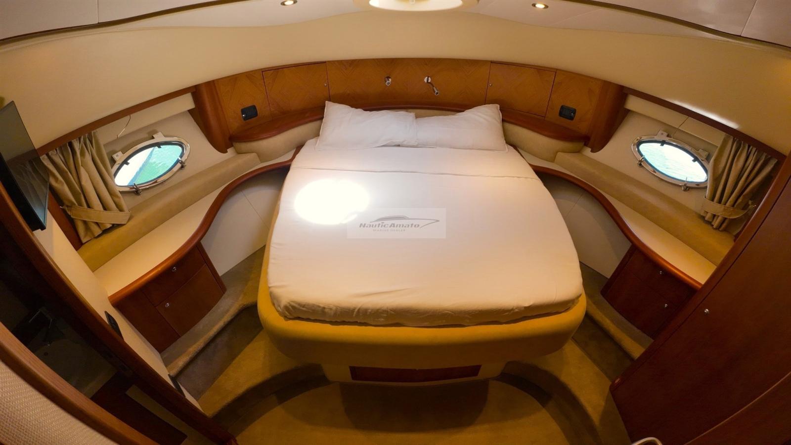 La cabine du propriétaire au milieu du navire dispose d’un lit double disposé en diagonale pour optimiser l’espace, d’un coin beauté/bureau et d’une salle de bain privée avec douche et bidet.
