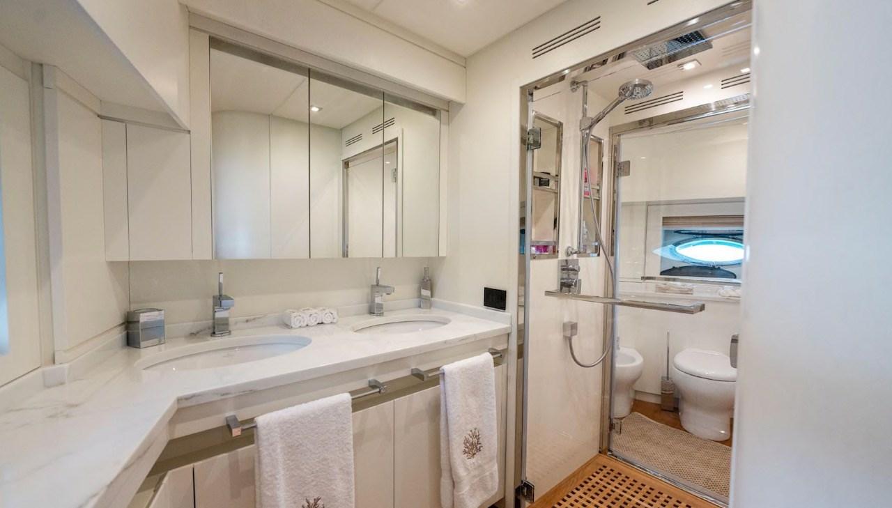 Cabine principale avec lit double et salle de bain - Cabine VIP avec lit double et salle de bain - Cabine d’invités avec deux lits plats et salle de bain - Cabine d’invités avec deux lits plats - Cabine simple - Salle de bain des invités.