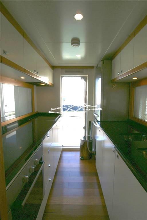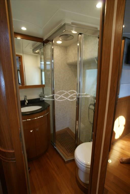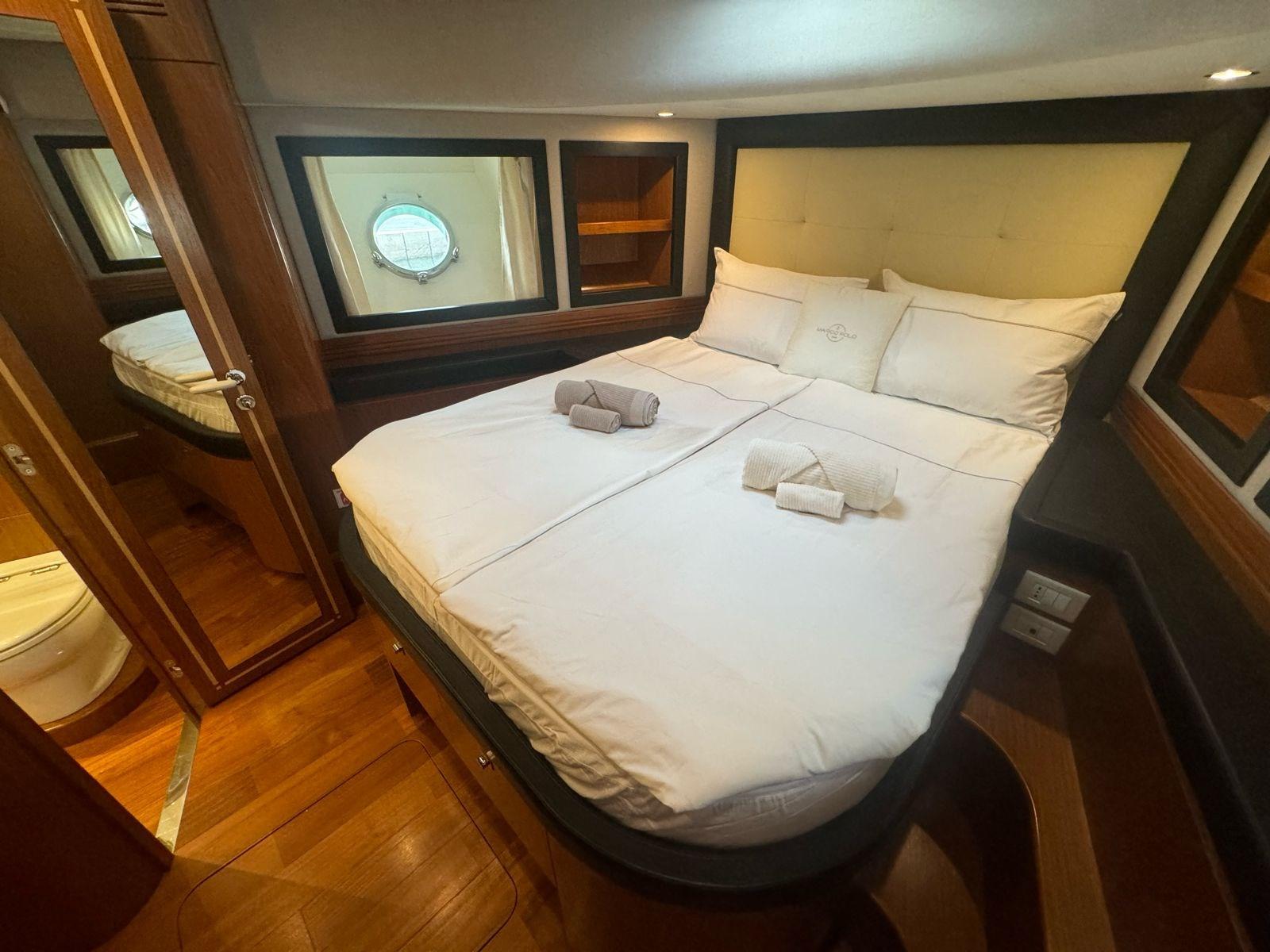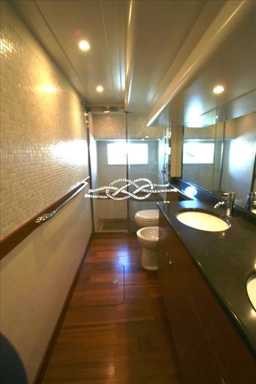 Cabine principale au milieu du navire avec lit double et petit dressing, salle de bain pleine largeur avec douche séparée - Cabine VIP avec lit double et salle de bain - cabine d’invités avec deux lits au sol - cabine d’invités simples - salle de bain d’invités - deux cabines d’équipage simples - salle de bain d’équipage.