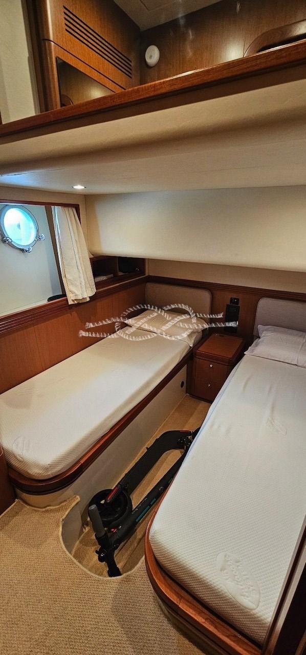 Cabine principale avec lit double et salle de bain avec cabine de douche (pas de bidet) - cabine d’invités avec deux lits plats - cabine d’invités avec deux lits croisés - salle de bain d’invités avec cabine de douche (pas de bidet).