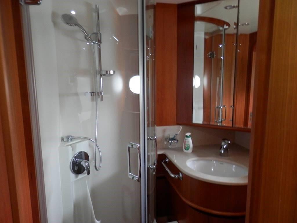 Cabine principale avec lit double, dressing, salle de bain avec douche séparée - Cabine VIP avec lit double et salle de bain - Cabine invités avec lit simple et salle de bain - Cabine invités avec deux lits plats et salle de bain.