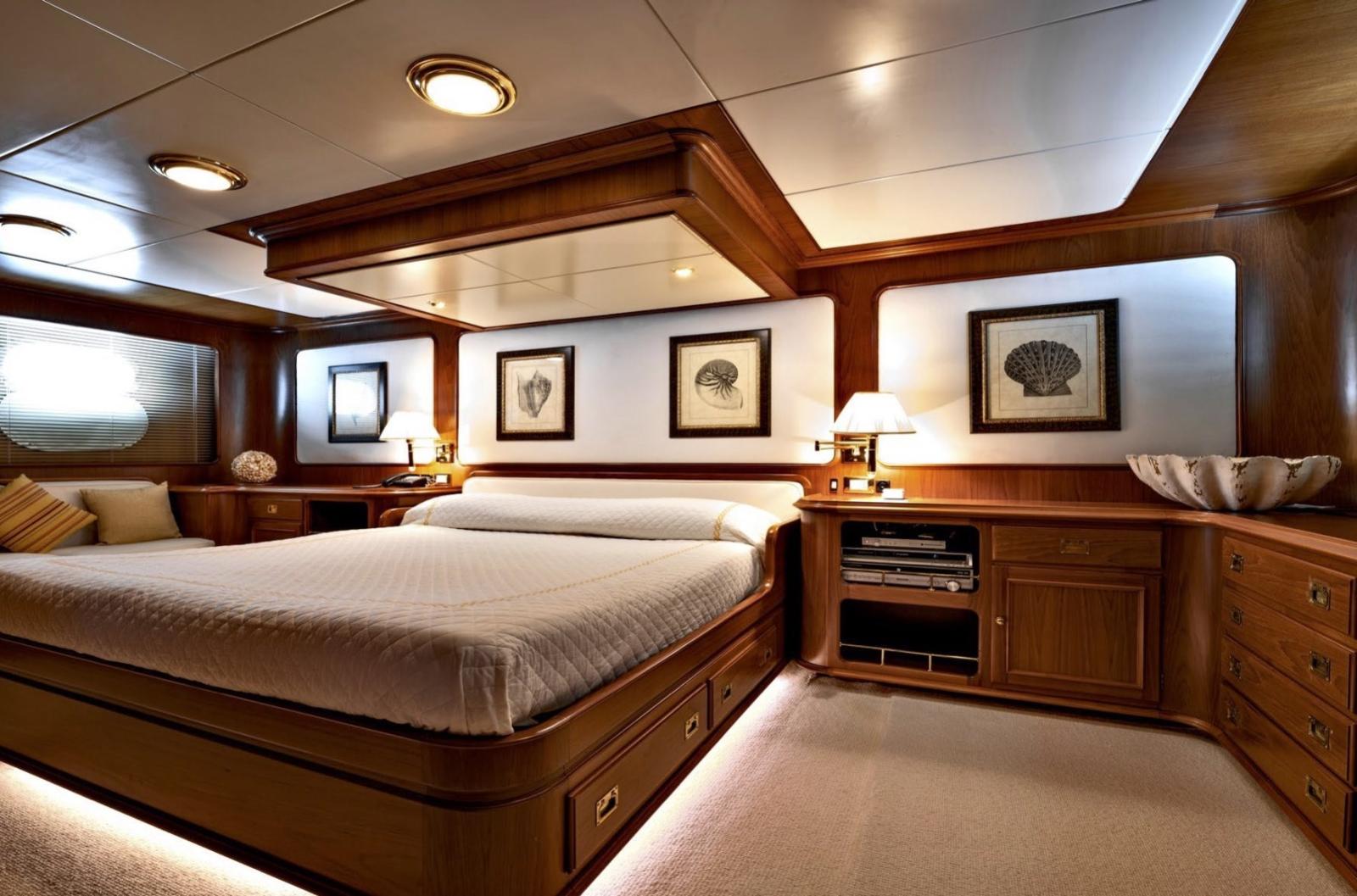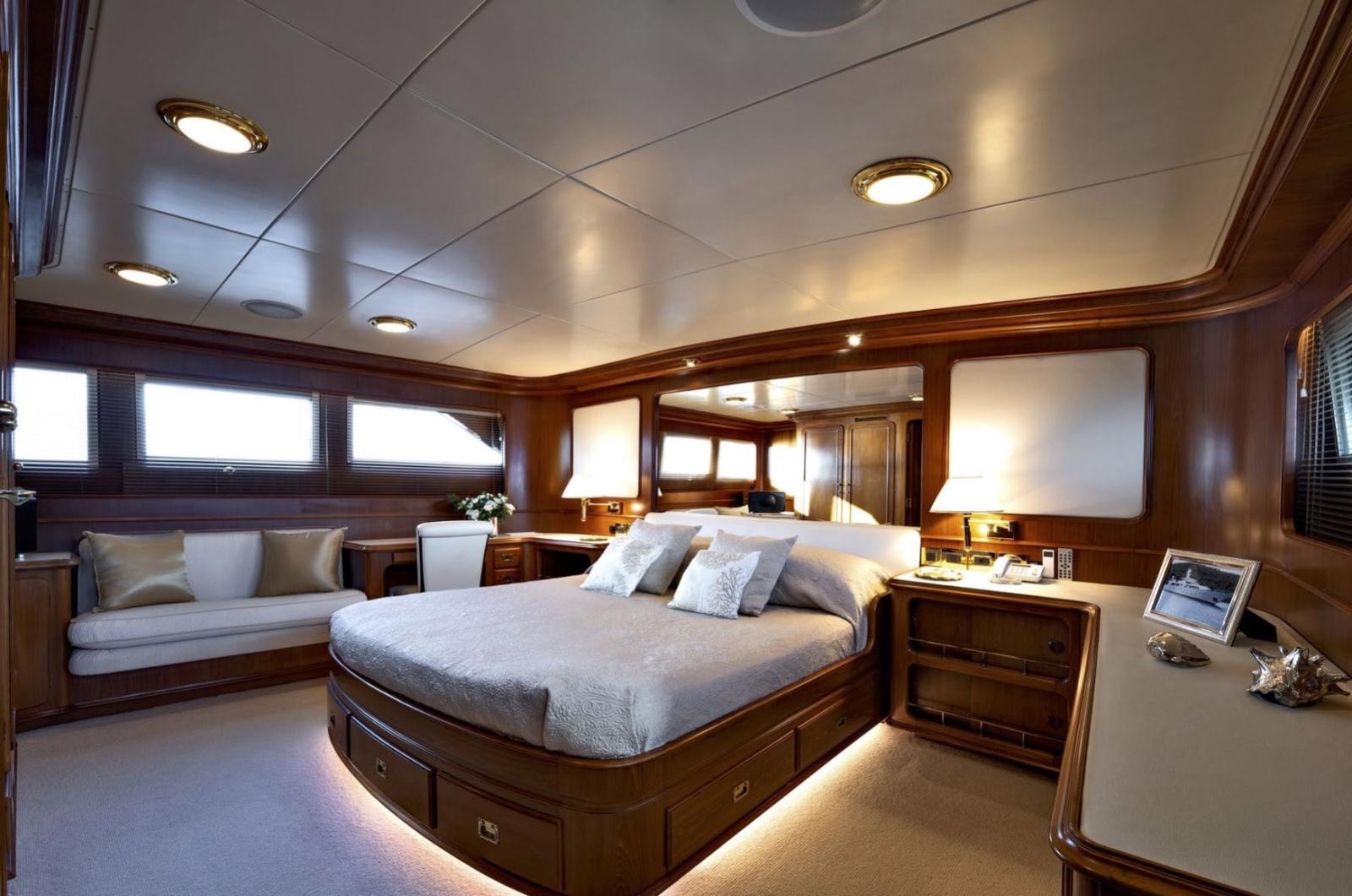 Cabine principale avec lit double et salle de bain sur le pont principal - Cabine VIP avec lit double et salle de bain - Cabine invités avec deux lits plats et salle de bain - Cabine invités avec deux lits plats et salle de bain - Cabine invités avec deux lits superposés et salle de bain.