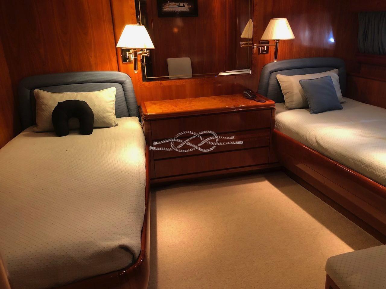 Cabine d’équipage avant avec deux lits et salle de bain - cabine d’équipage arrière avec lit simple et salle de bain.