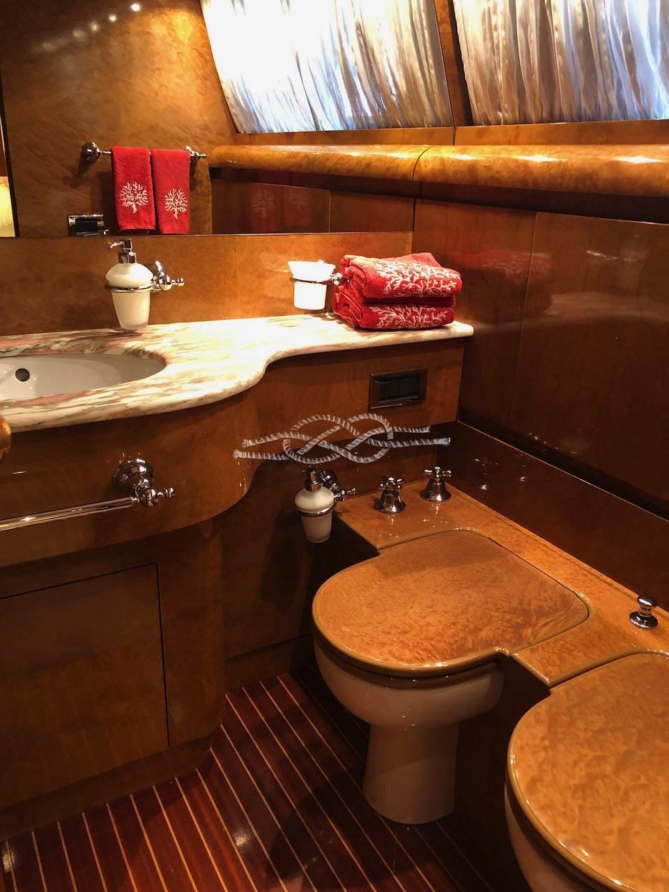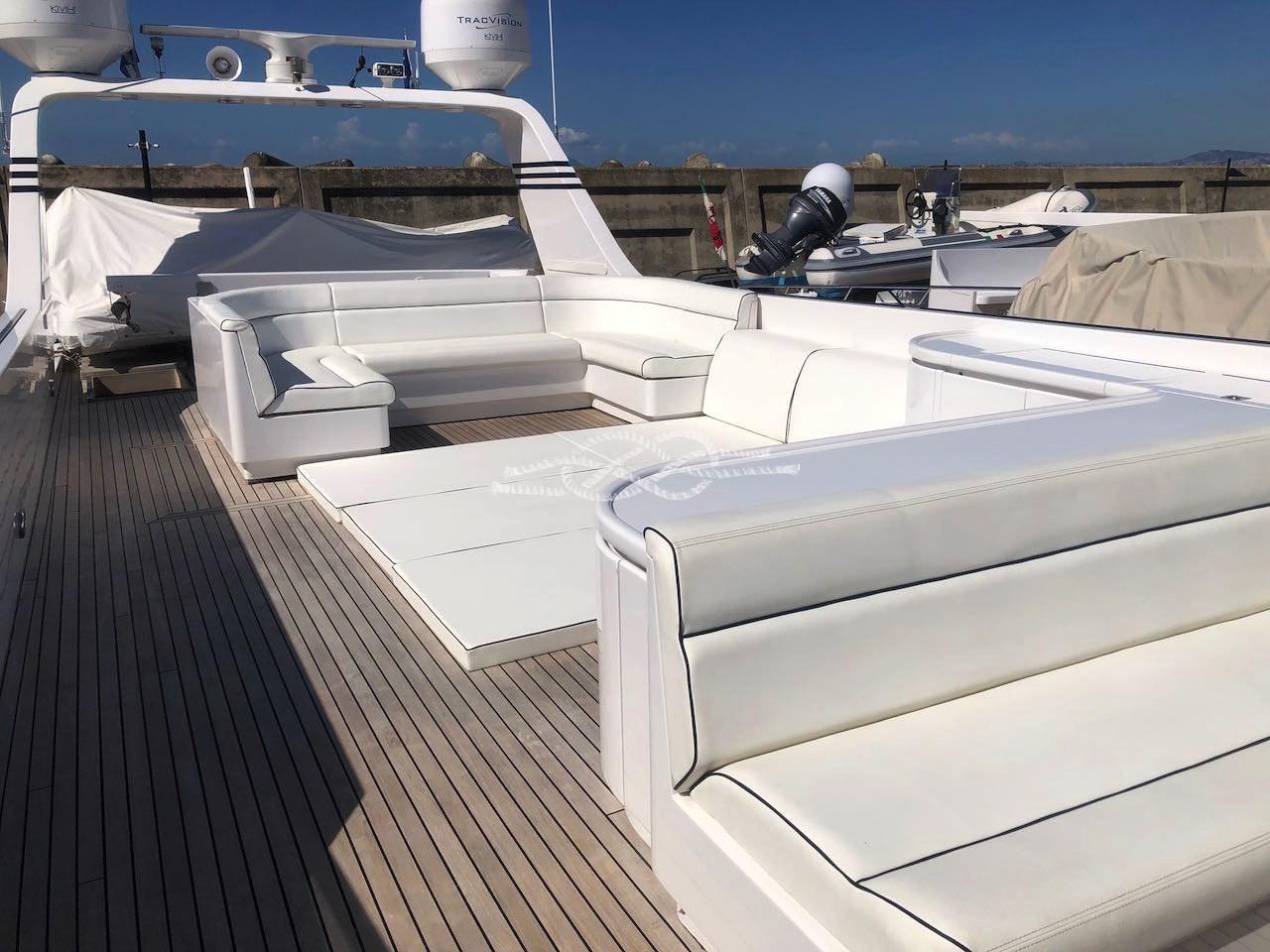Alarme moteur, Alarme de pompe de cale, Eau sous pression, 23 Batteries, Système de vidange, Passavant en teck, Douche de cockpit, Double barre à roue, Propulseur d'étrave (idraulica), Flaps hydrauliques, Grue de flybridge, Extincteur(s) fixe(s), Indicateurs de flaps, Spots sous-marins, Passerelle, Plateforme arrière, Porte latérale, Porte latérale, Cockpit en teck, Prise de quai, Connexion eau sous pression à quai, Rollbar, Guindeau électrique, Echelle de bain, Selles pour Annexe, table de cockpit, Annexe (con fuoribordo), Corne, Winch électrique arrière.