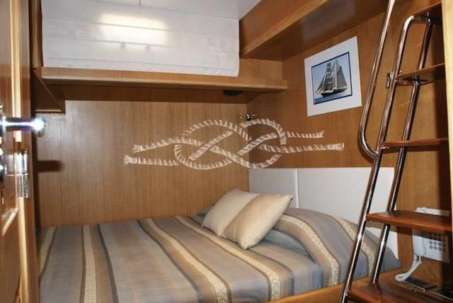 Cabine propriétaire avec salle de bain - cabine invités avec deux lits plats - salle de bain invités - cabine équipage avec deux lits et salle de bain - cabine arrière avec lit double et salle de bains.