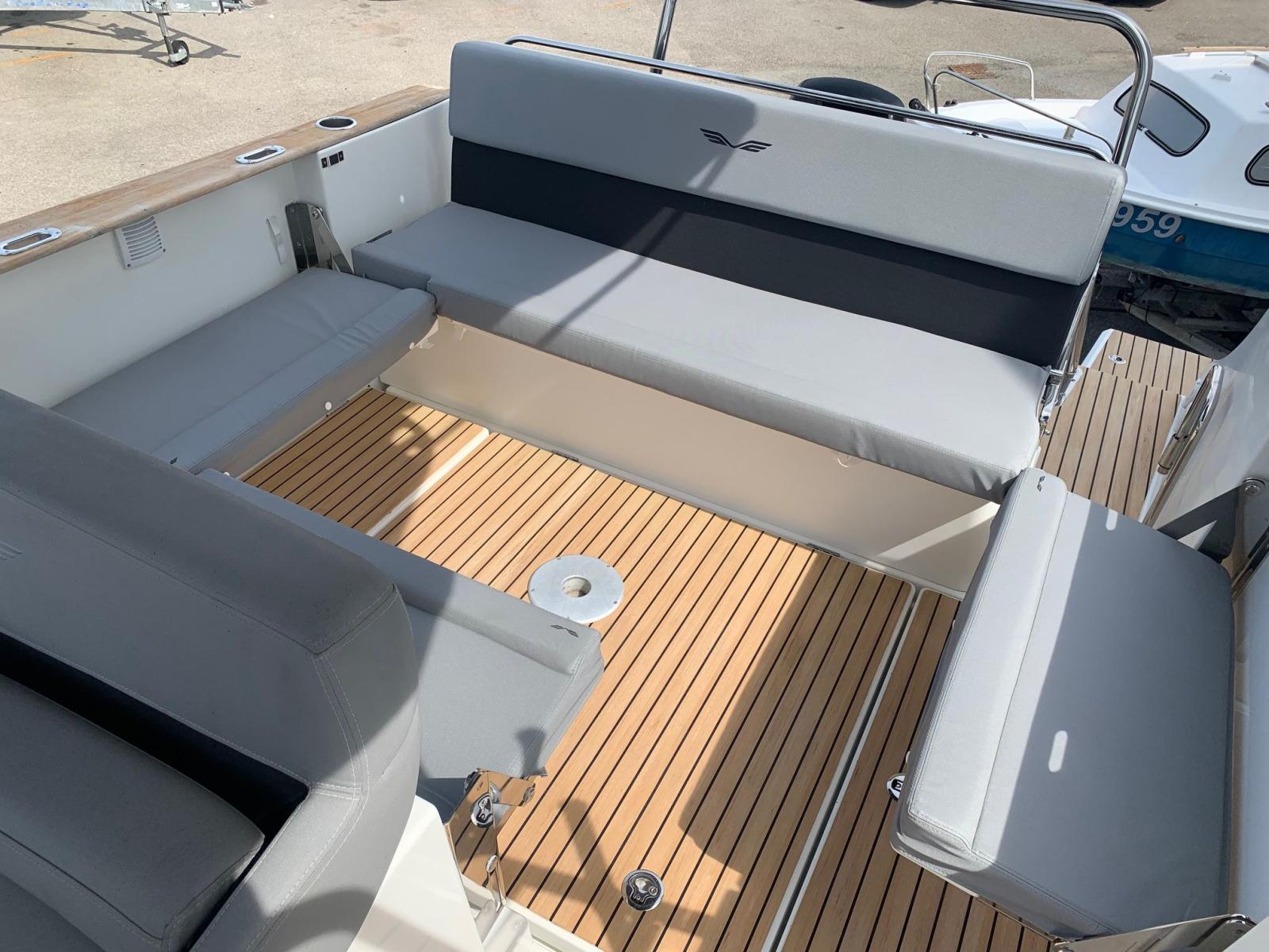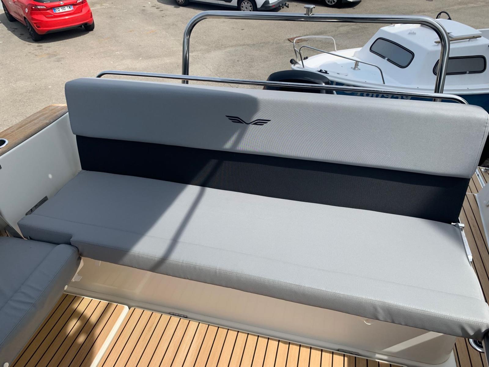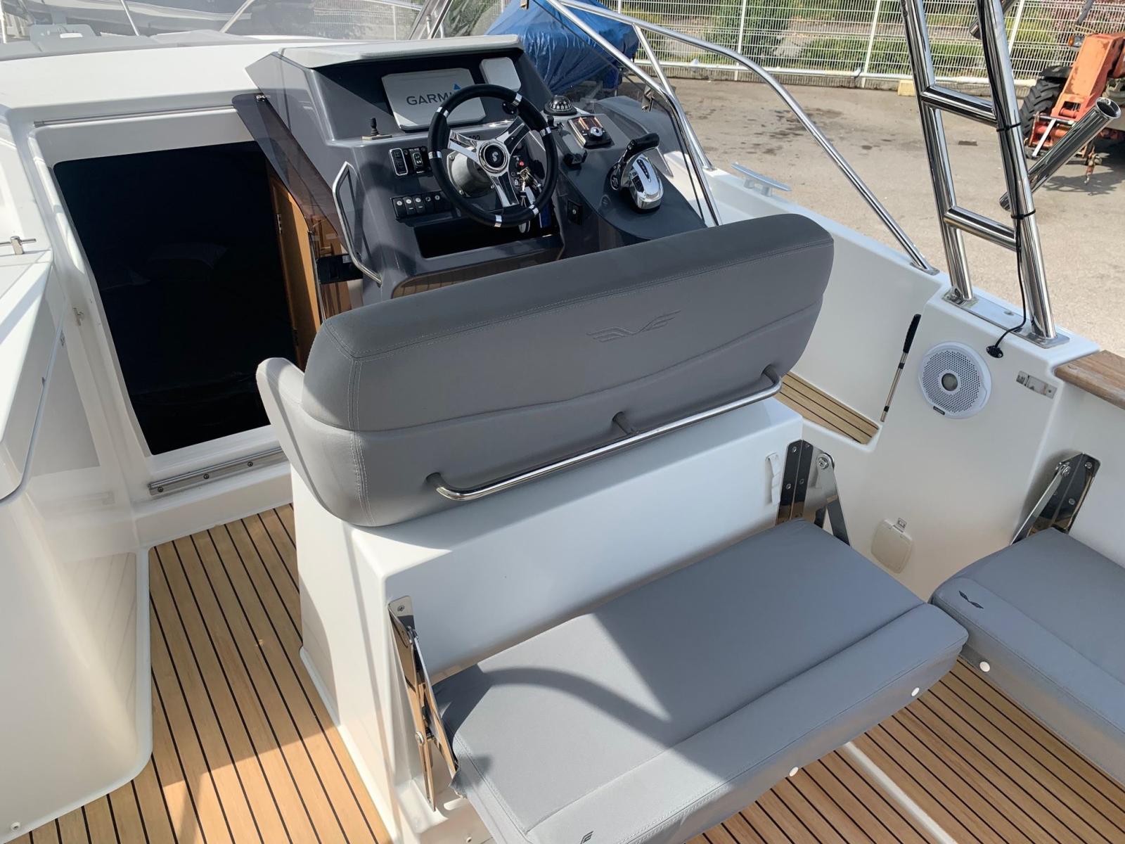 Equipement: Finition confort, TTOP Inox et Toile Graphite, 2 Banquettes de cockpit repliables, Mât de ski, Propuseur d'étrave, Four micro-onde, réservoir carburant 600L, Flexiteek cockpit et jupes, Flaps automatiques Zipwake, Pack électronique GARMIN 92 et Pack Sound Fusion, Kit mouillage complet et armement côtier.