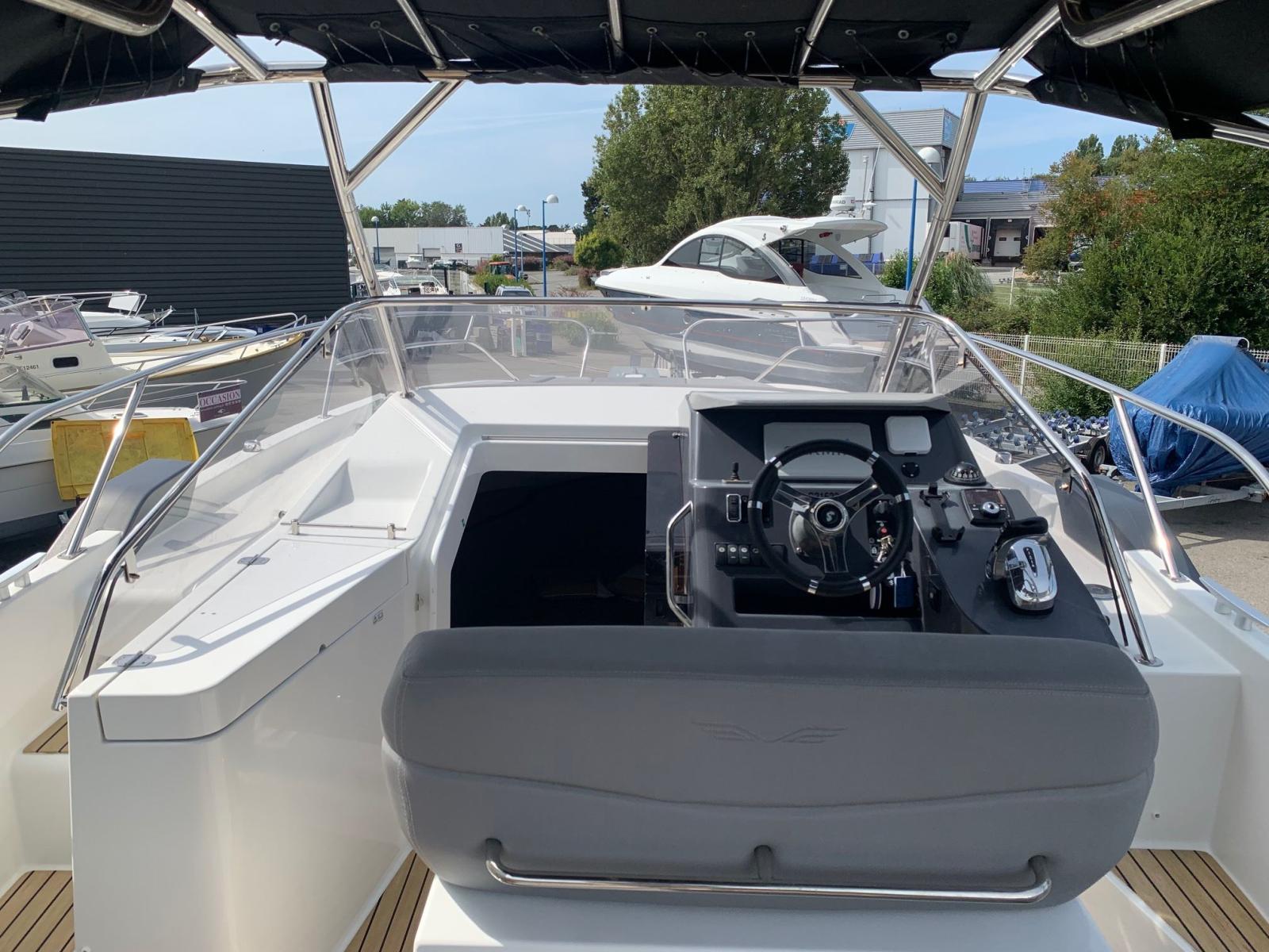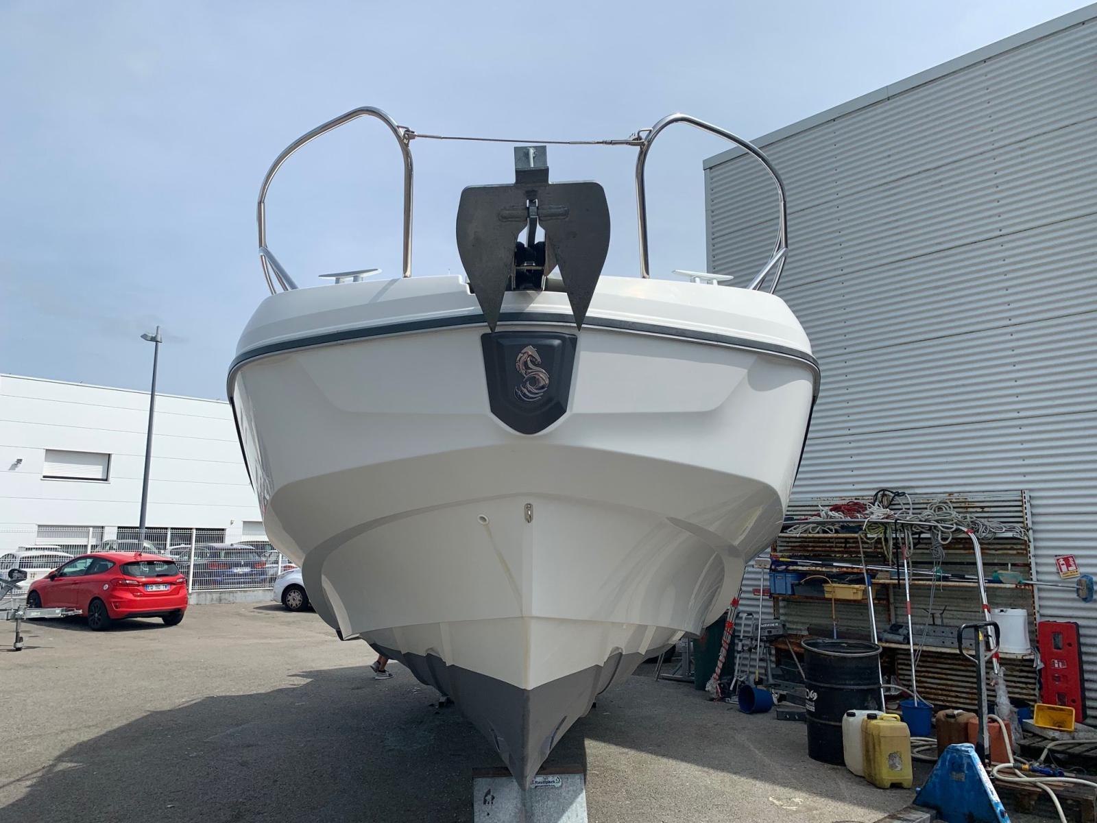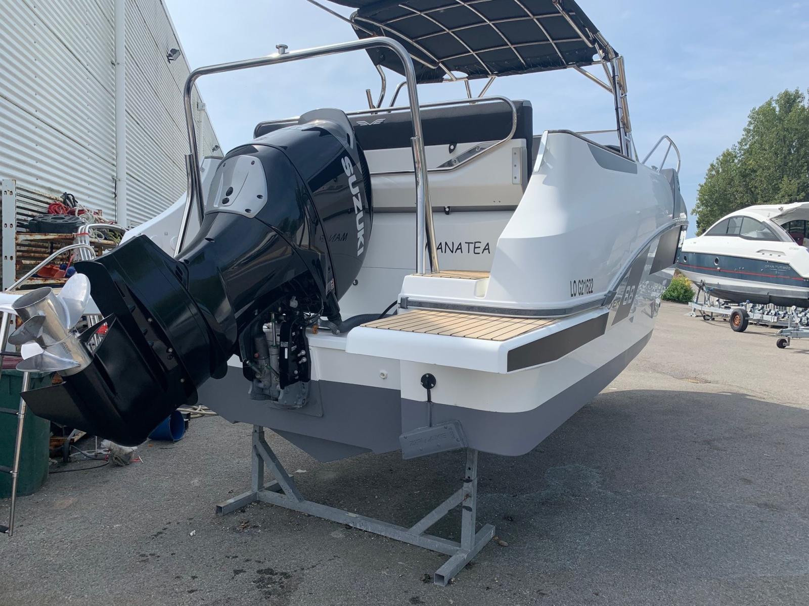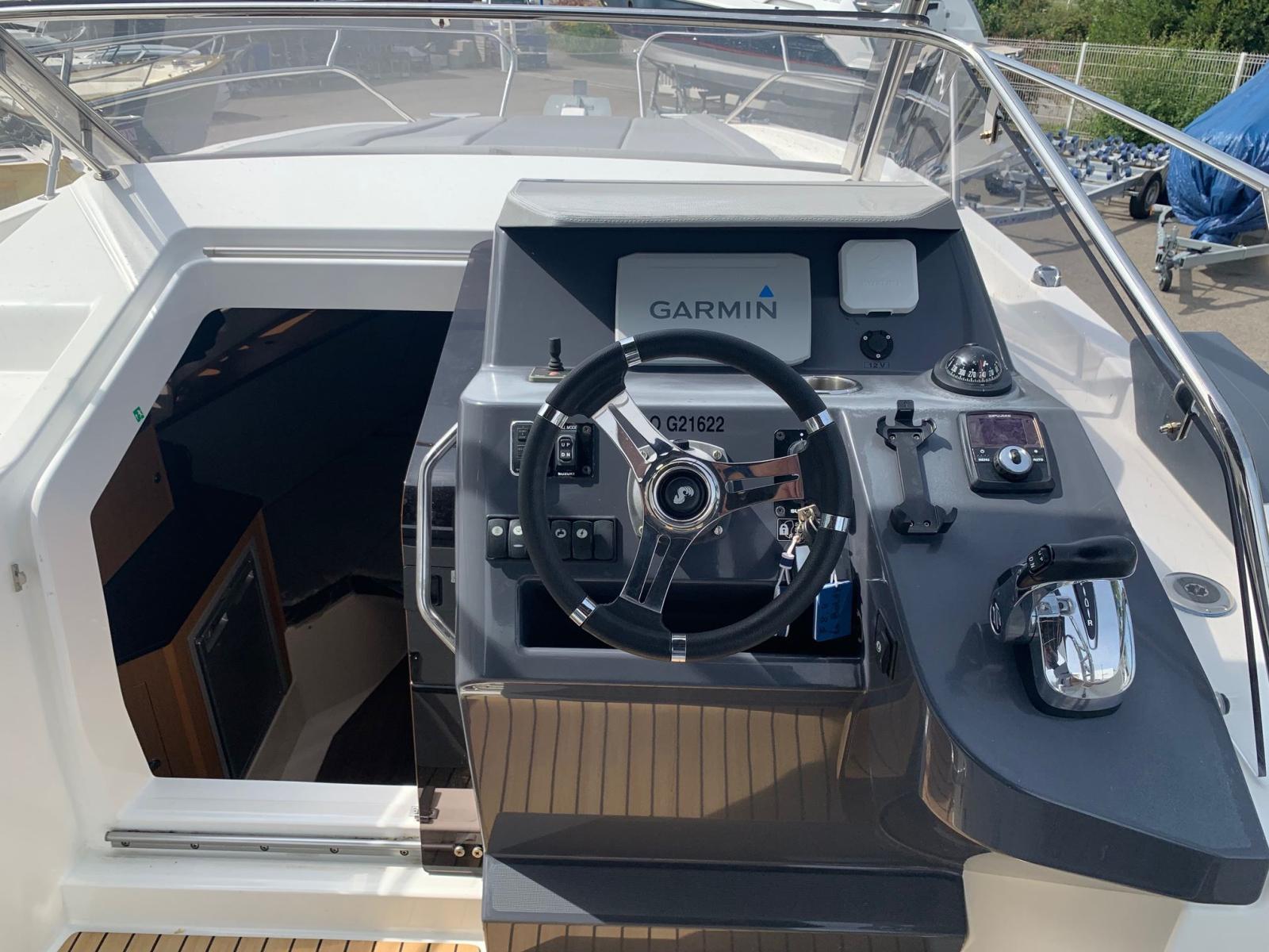 Equipement: Finition confort, TTOP Inox et Toile Graphite, 2 Banquettes de cockpit repliables, Mât de ski, Propuseur d'étrave, Four micro-onde, réservoir carburant 600L, Flexiteek cockpit et jupes, Flaps automatiques Zipwake, Pack électronique GARMIN 92 et Pack Sound Fusion, Kit mouillage complet et armement côtier.
