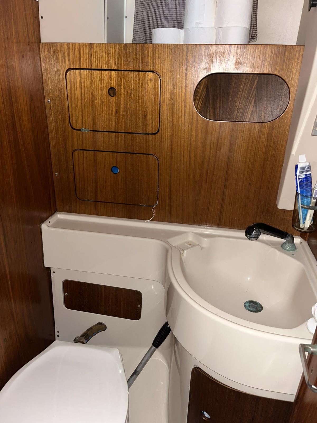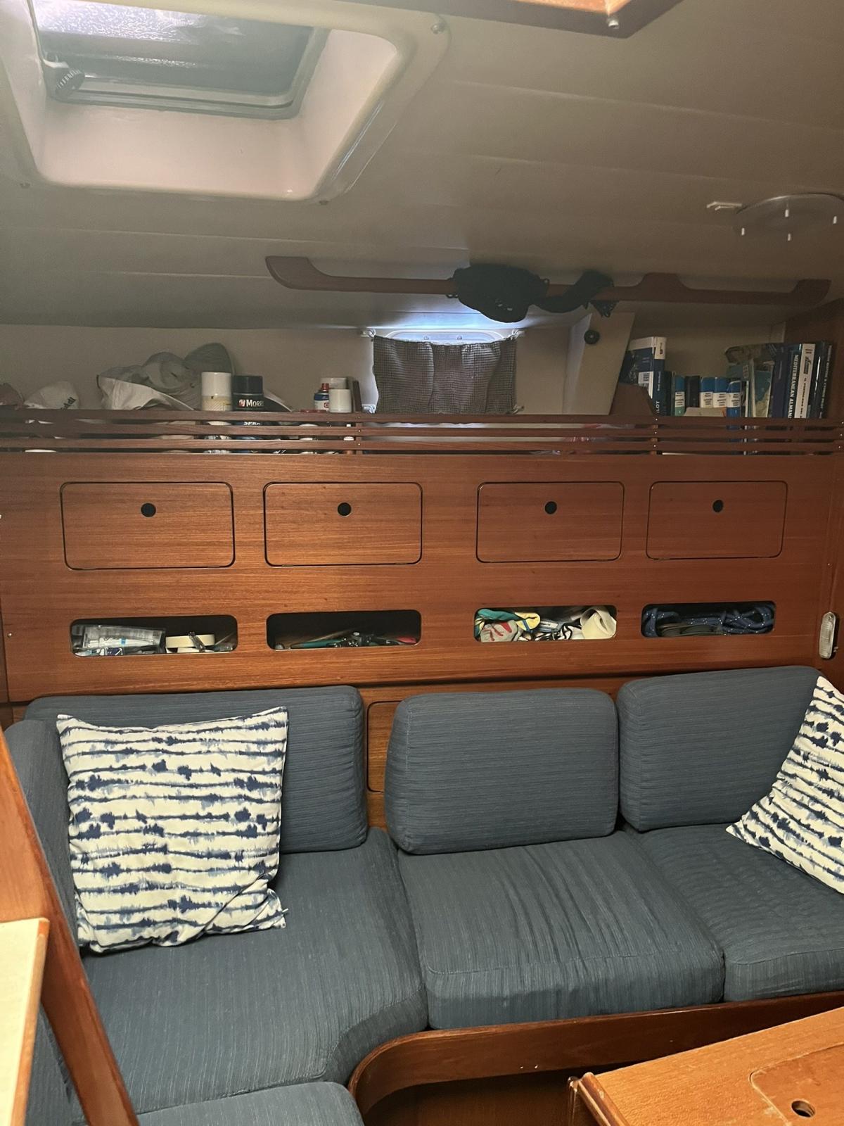 Eau sous pression, Douche de cockpit, Éolienne, Pompe de cale manuelle, Prise de quai, Guindeau électrique, Echelle de bain, table de cockpit.