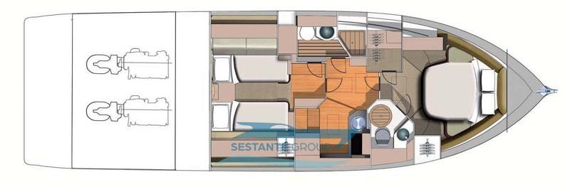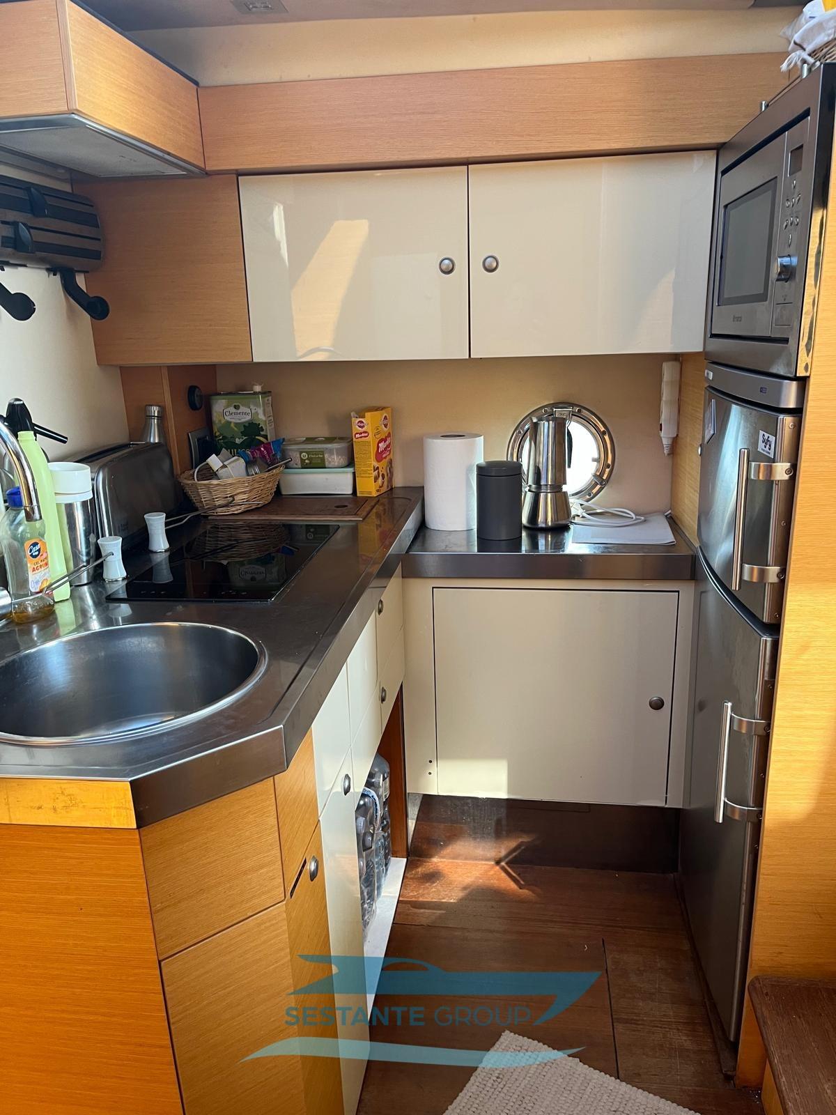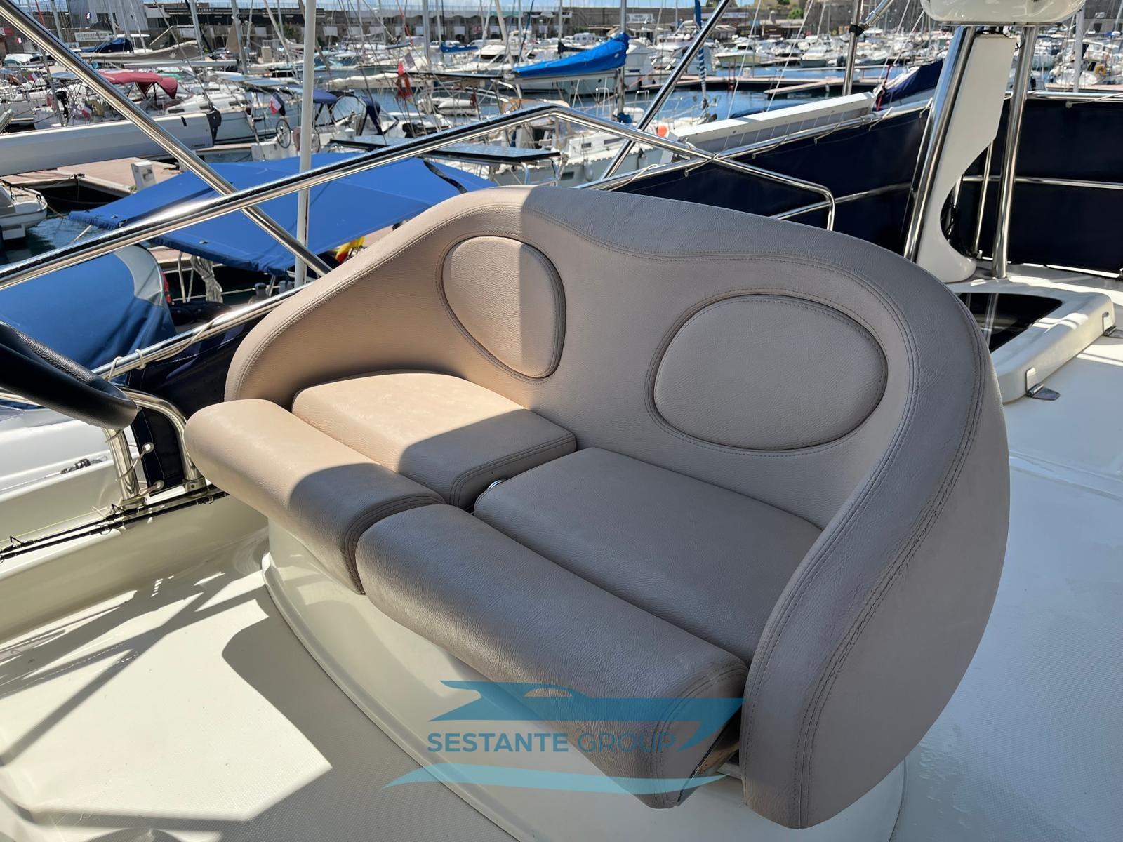 Eau sous pression, Douche de cockpit, Double barre à roue, Lavabo dans le cockpit, Éclairage de courtoisie, Panneau solaire, Passerelle (Besenzoni), Pompe de cale automatique, Prise de quai, Guindeau électrique, Echelle de bain, table de cockpit, Annexe (Zodiac Motore Honda 6 Hp), Corne, Winch électrique arrière.