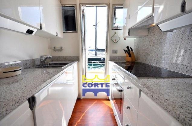 Cuisine équipée d’une plaque en céramique à 5 brûleurs, d’un four réfrigérateur, d’un congélateur, d’un lave-vaisselle et d’une porte de sortie sur la trottoir.