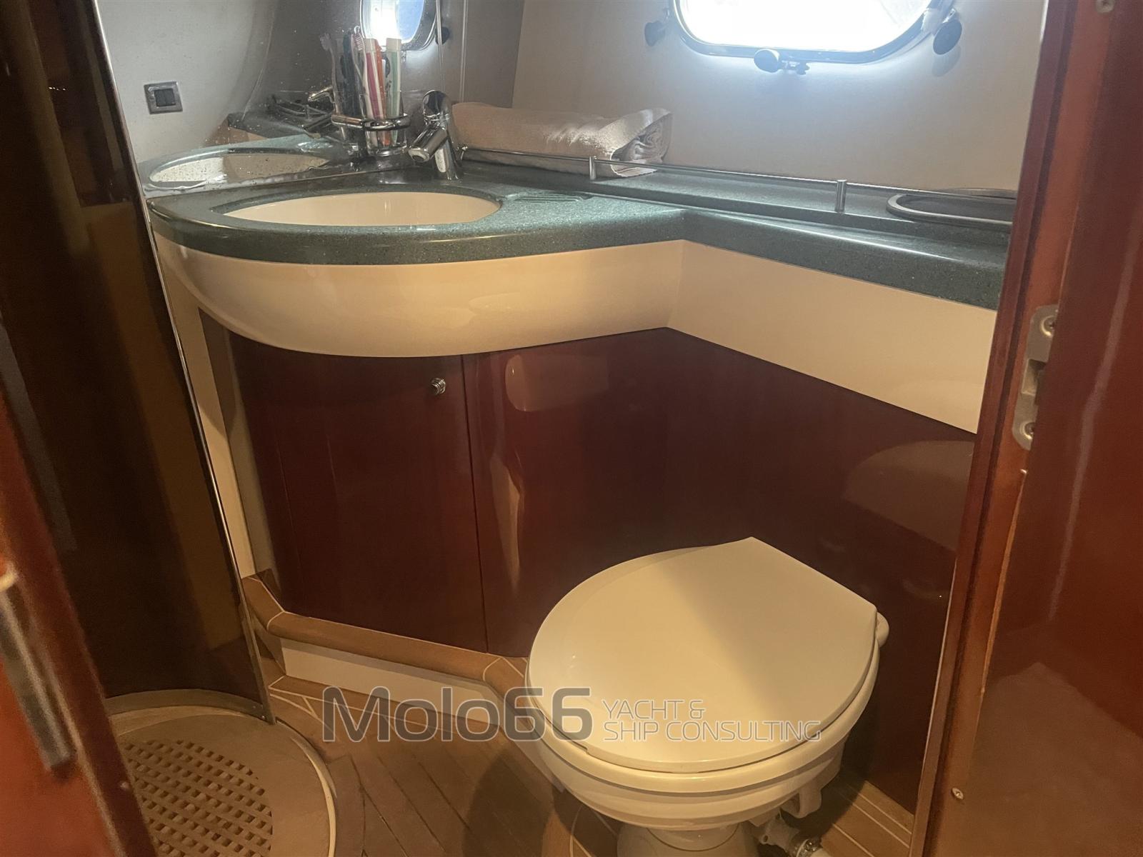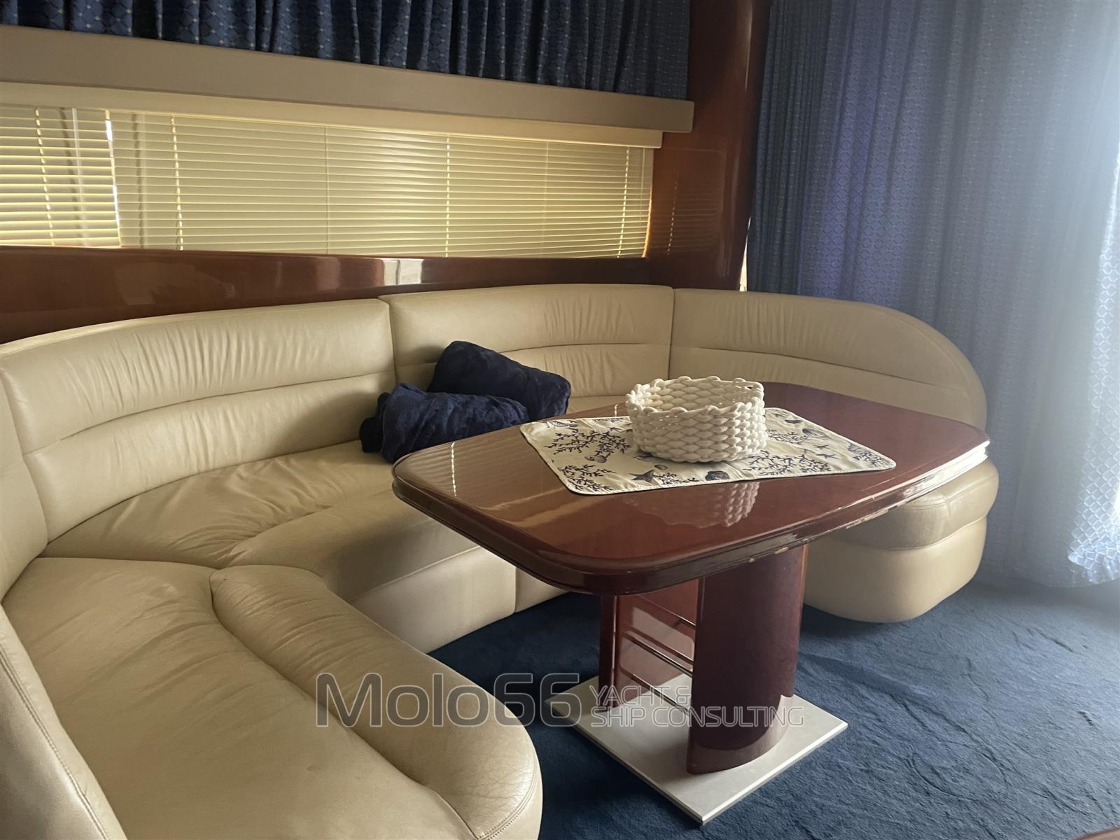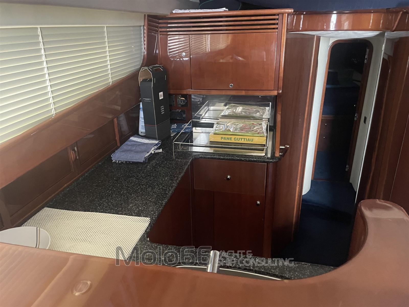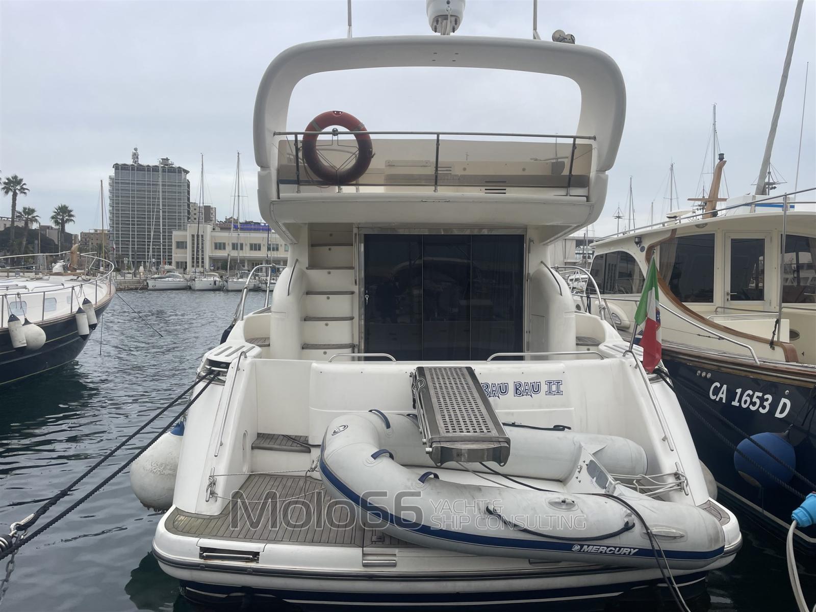 Alarme moteur, Alarme de pompe de cale, Eau sous pression, Douche de cockpit, Double barre à roue, Phare de poursuite, Flaps hydrauliques, Extincteur(s) fixe(s), Passerelle (elettrica), Cockpit en teck, Prise de quai, Répétiteur électronique, Guindeau électrique, Echelle de bain, Annexe.