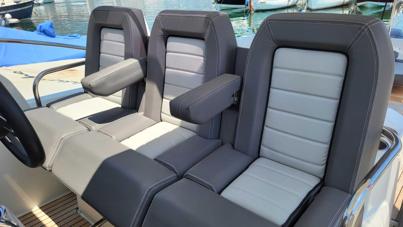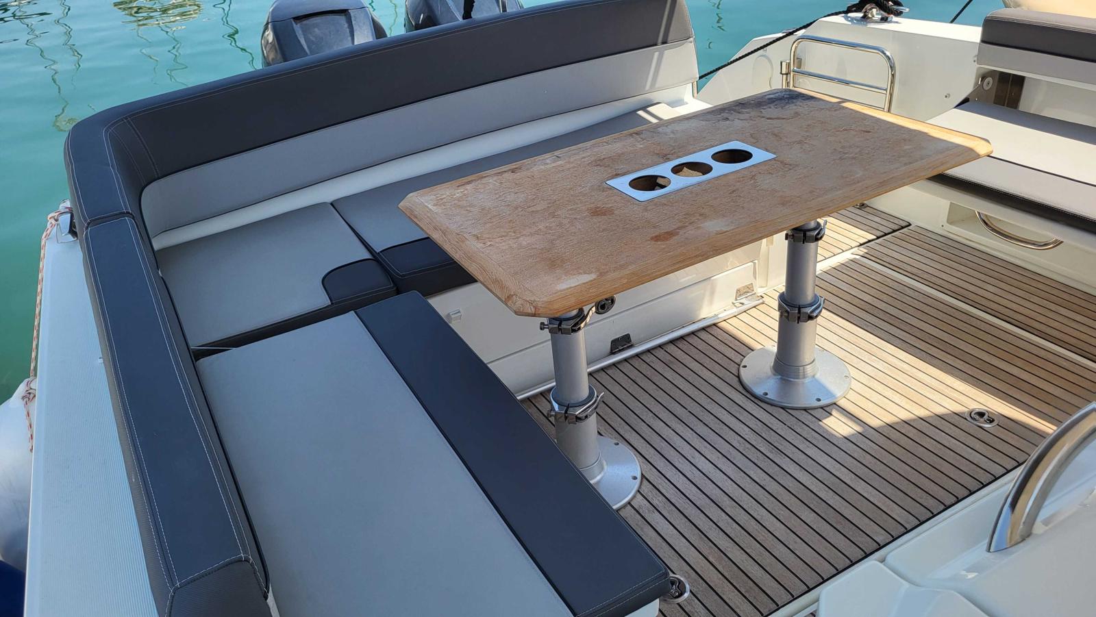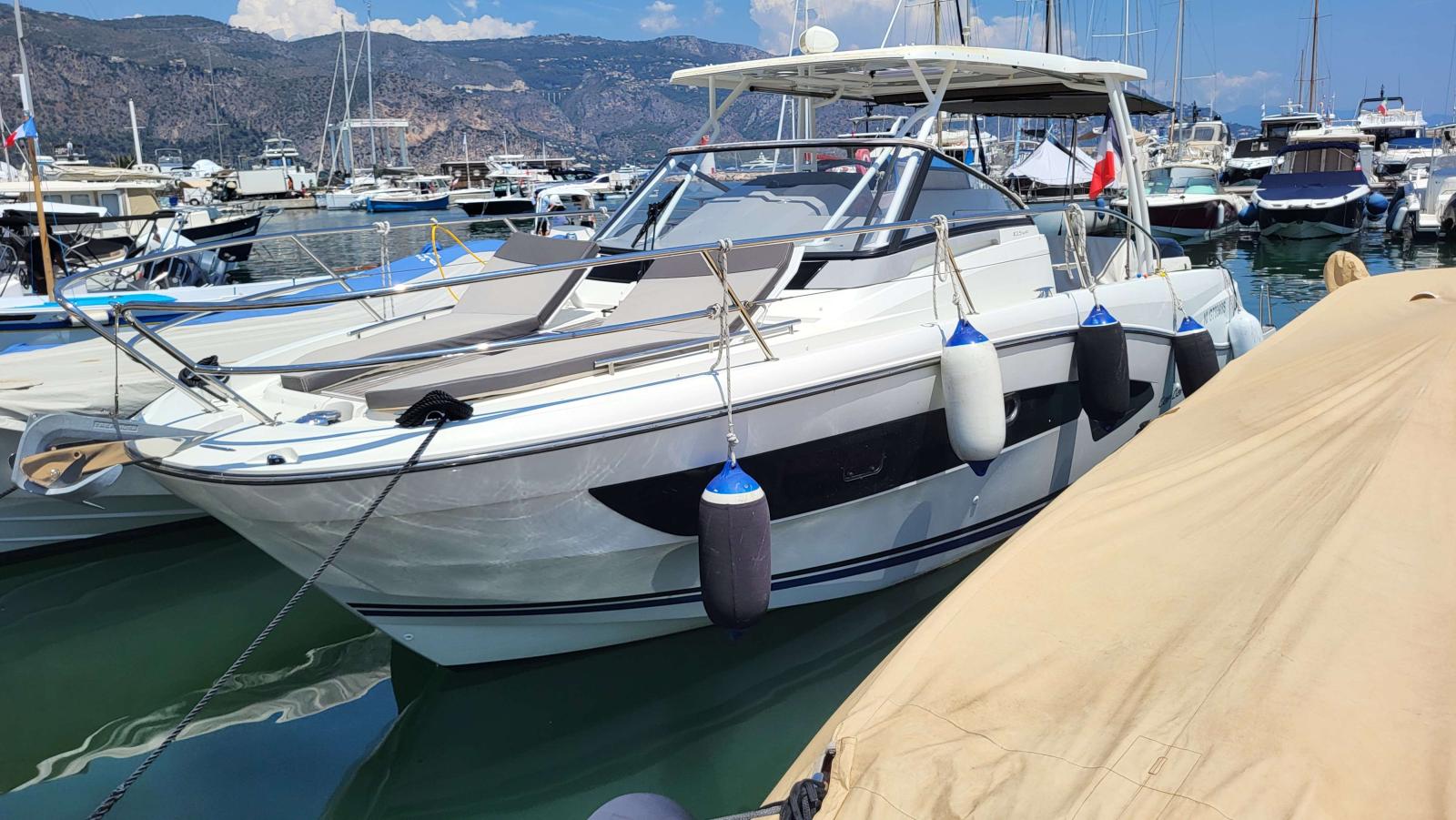 Configuration idéale pour les croisières et sorties à la journée, ce bateau offre confort, puissance et équipements haut de gamme. Il dispose d’un groupe électrogène, deux réfrigérateurs (inté-rieur et cockpit), une plancha extérieure, un grand carré de cockpit transformable, bain de soleil avant, cabine double fermée avec couchage supplémentaire, salle d’eau avec WC électrique et douche, poste de pilotage équipé, GPS traceur, VHF, guindeau électrique, flaps, taud de soleil, douchette de cockpit, plateforme de bain, sellerie en excellent état,