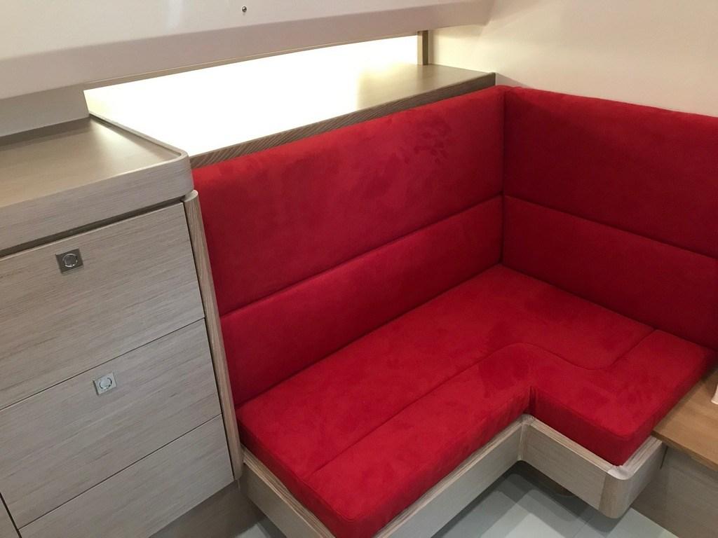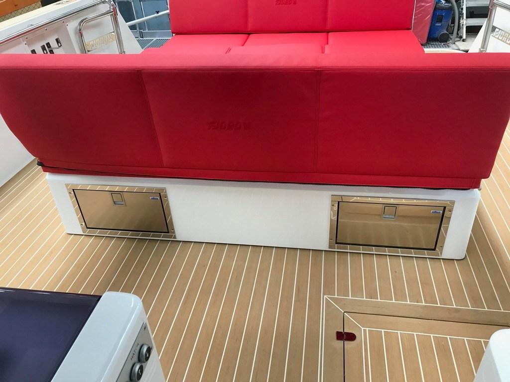 Bimini (aft black mash + 2 poles), 3 Sellerie complète (Pilot seats Silvertex red), 3 Coussin avant (Silvertex red), 5 sellerie de cockpit (Silvertex red), 6 Taud de siège (light grey).