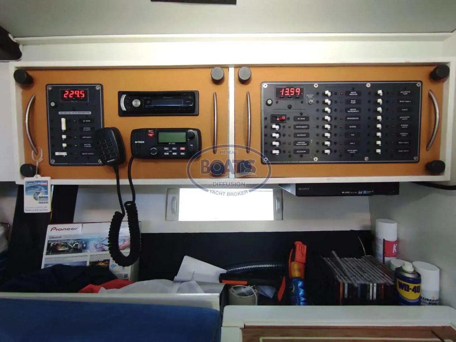 Le Sly 47 a un rouf étroit et fuselé avec de longues fenêtres latérales, un signe distinctif de tous les modèles Sly Yachts. Sur le pont double timonerie, 6 winchs dont 4 électriques. Mat et bôme Aluminium SELDEN. Bout dehors Carbone de 2m/Ridoir de Pataras hydraulique SELDEN/enrouleur SELDEN Furlex MKII. Electronique complet Garmin et Raymarine + 3 écrans Raymarine i70s / 1 compas magnétique 9 axes NS360 Pocket V2 / Ais 600 / VHF M-TECH Mt-500/ pilote-auto .