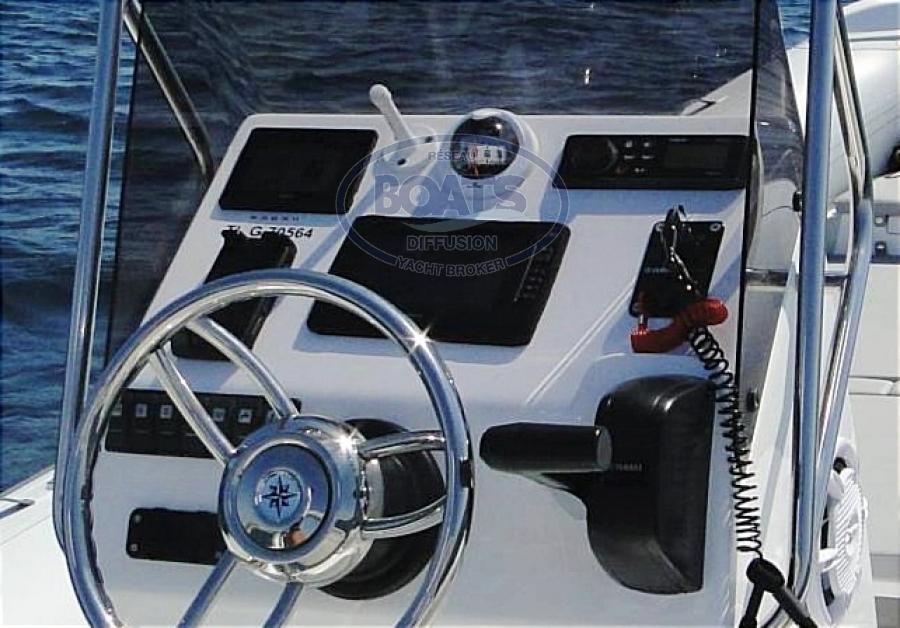 Beau semi-rigide séduisant que ce Master 730 Open modèle 2023. Il est doté d'une carène de référence dans la gamme. Excellent en ligne droite, quel que soit l'angle d'attaque des vagues, et particulièrement confortable en vitesse de croisière (25-30 nœuds de 3 500 à 4 000 tr/min), le Master 730 est tout aussi à l'aise en virages, ou l'on apprécie sa direction précise. Propulse par un YAMAHA F225 il permet d'atteindre rapidement une vitesse de 45-47 nœuds.