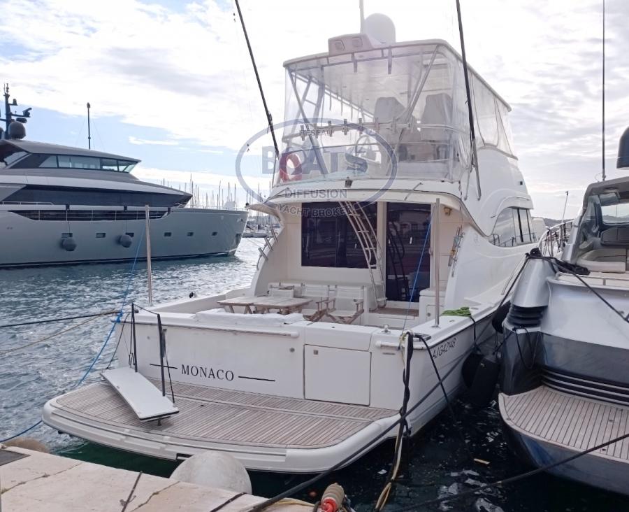 Le poste de commande au fly est spacieux doté de deux fauteuils de pilotage haut de gamme. La console du tableau de bord est sur vérins escamotable pour offrir encore plus de place au mouillage dans cette immense flybridge. Il possède une grue électrique d'une capacité de 400kg, et tout l'équipement pour la pêche en haute mer.(2 tangons de pêche: Outrigger LEE télescopique Carbone inox