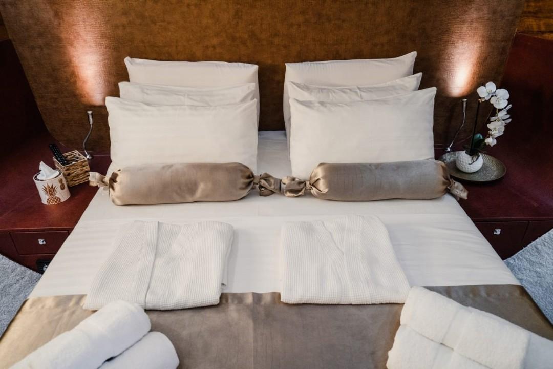 Le Fashion 68 propose trois cabines luxueuses avec salles de bain privatives une cabine master une cabine VIP et une cabine twin ainsi qu’une cabine skipper pour deux per-sonnes le salon spacieux et lumineux est équipé d’un toit ouvrant électrique la cuisine est entièrement équipée et la plateforme de baignade donne accès à un garage à annexe