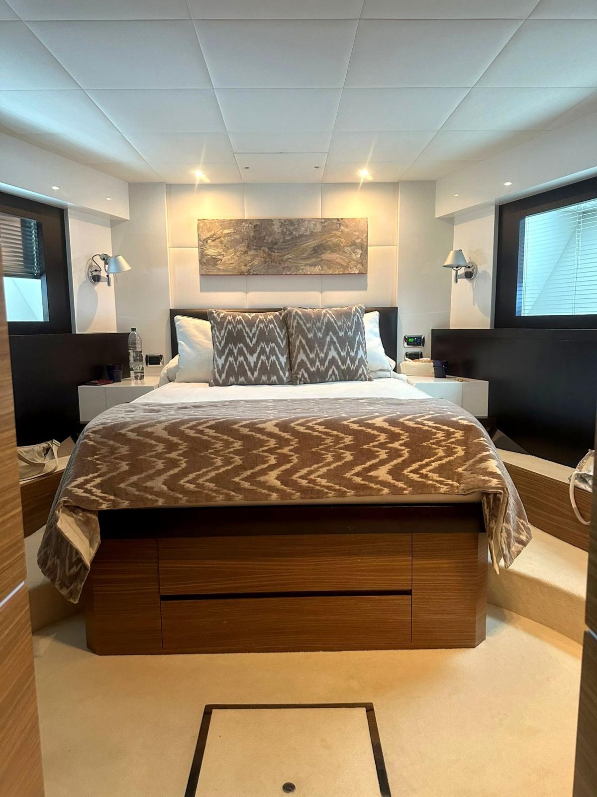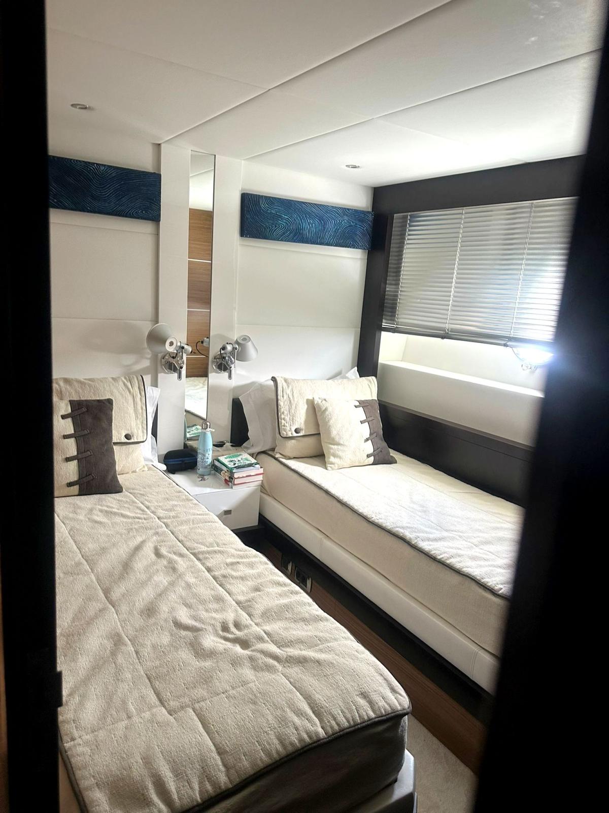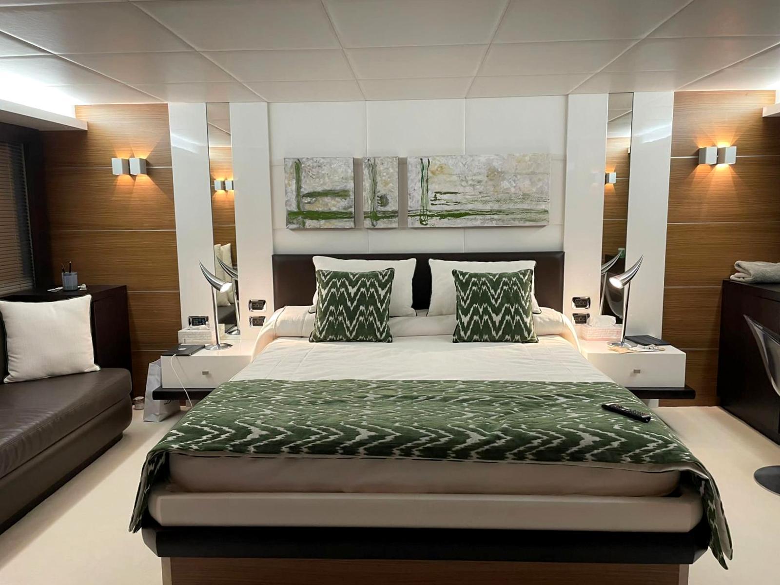 Ce yacht flybridge de prestige offre un confort exceptionnel avec 4 cabines invités, toutes équipées de leur salle de bain privative. La cabine armateur est située au centre du navire, la cabine VIP à l’avant, et deux cabines latérales avec lits jumeaux complètent l’espace nuit. Une cabine équipage indépendante dispose de deux couchages et d’une salle d’eau.