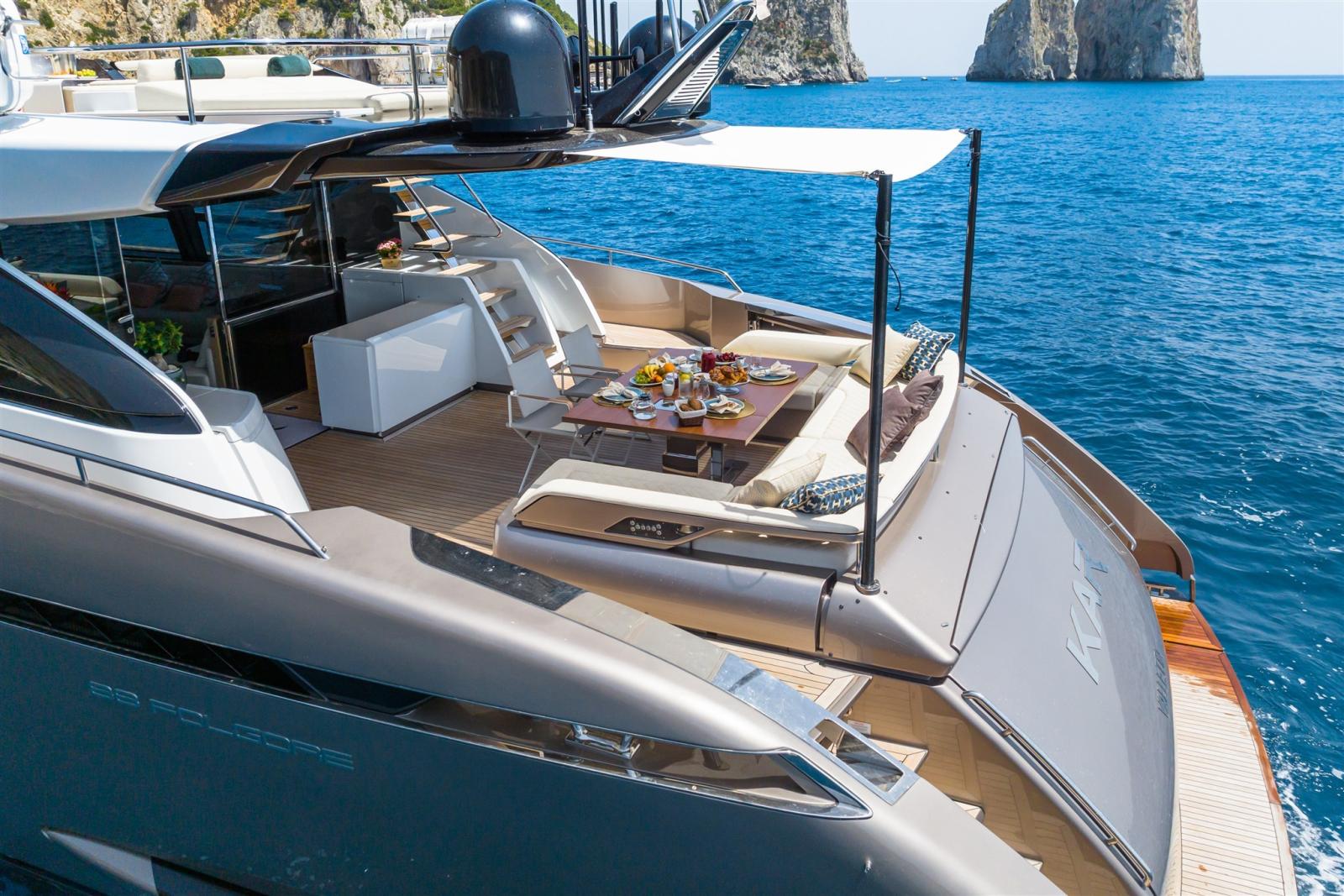 Antenne satellite TV (KVH TV6 TV SAT), Décodeur satellite, TV Ready (Sistema Sofabaton), Hi-Fi (Sonance - Premium Sound per esterni con altoparlanti HQ e AirPlay automatico/indipendente su prua, pozzetto e flybridge).
