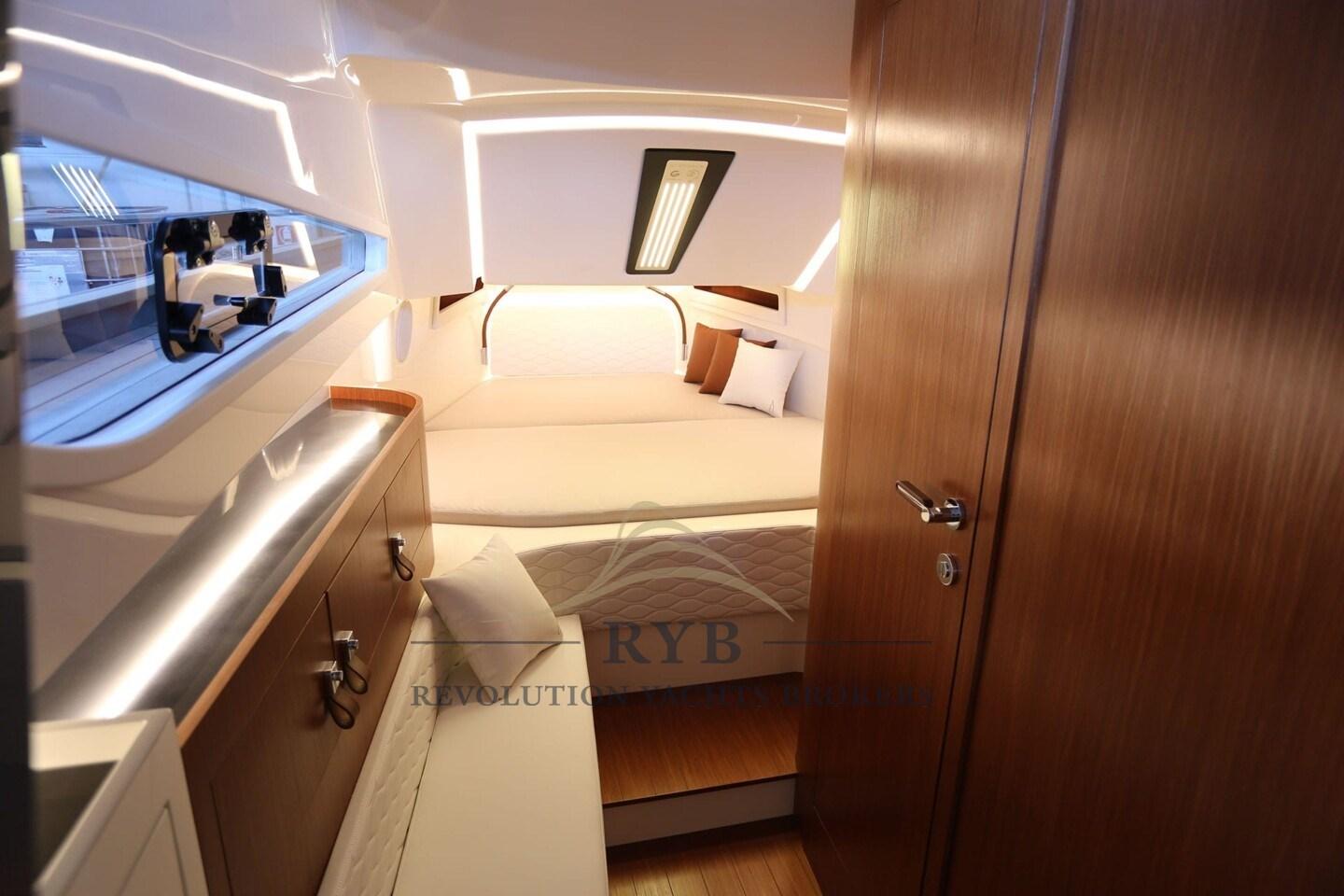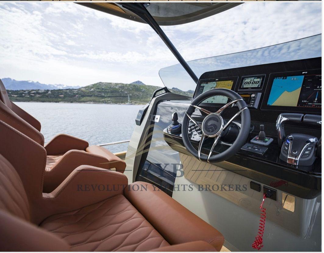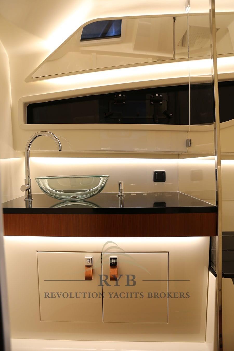 Eau sous pression, Taquets pliants, 2 Douche de cockpit (1 FISSA - 1 MOBILE IN CARBONIO), Phare de poursuite, Éclairage de courtoisie, Spots sous-marins, Plateforme arrière, Prise de quai, Guindeau électrique, Echelle de bain, Table, Corne.