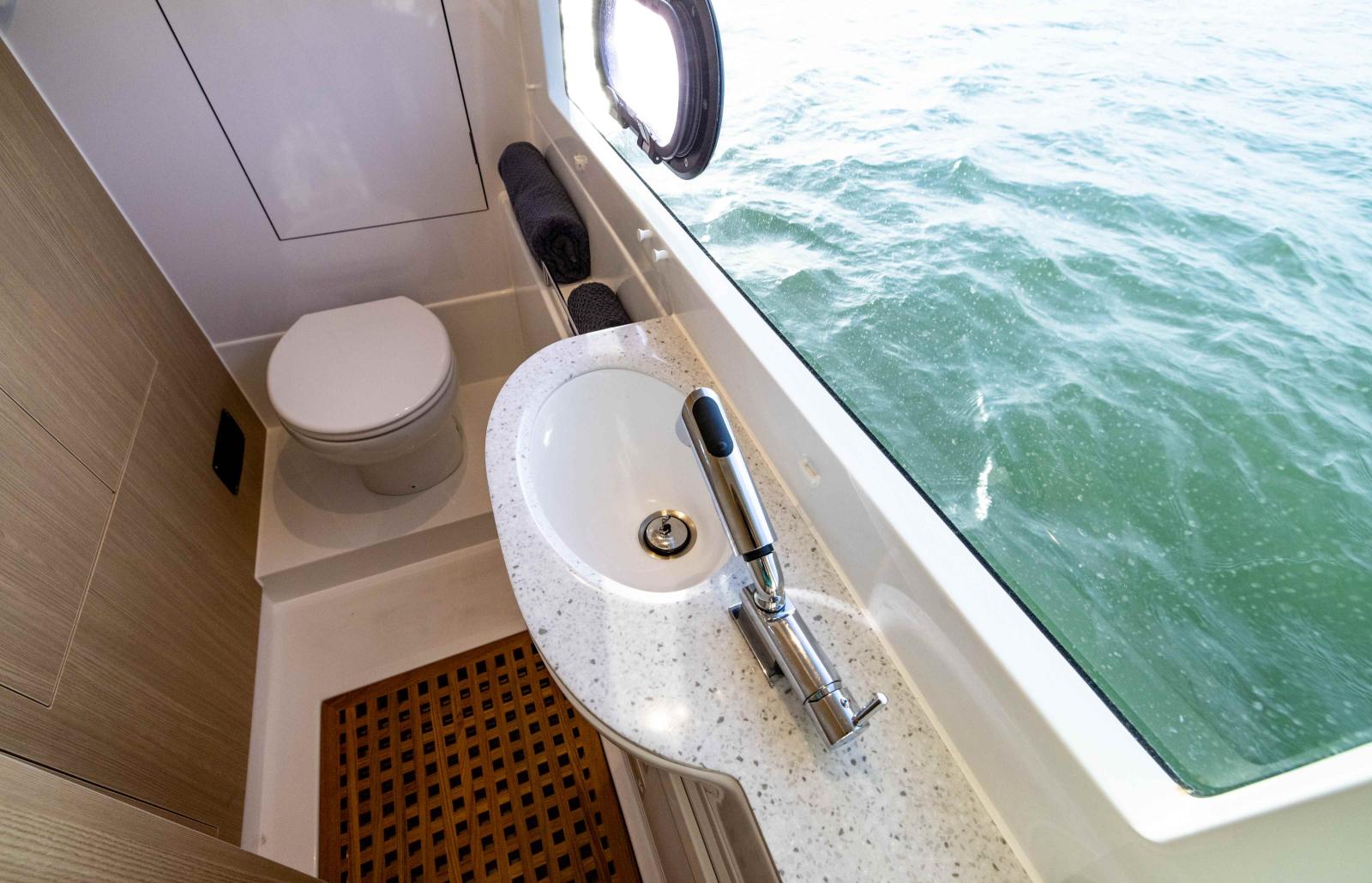 Avec ses deux coques larges et sa plateforme ouverte, le 36 Sport offre une habitabilité impressionnante : salon spacieux, poste de pilotage ergonomique, deux cabines doubles avec salle de bain privative — le tout climatisé* pour un confort total.