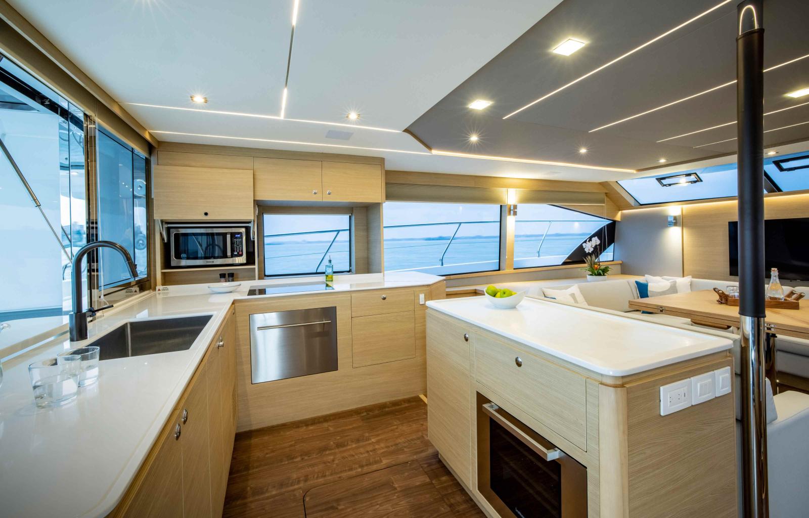 Dès l’embarquement, on est frappé par l’ampleur des volumes, dignes d’un yacht bien plus grand. Jusqu’à six cabines avec salle de bain privative, des finitions haut de gamme, une cuisine spacieuse, un salon baigné de lumière naturelle : chaque espace est pensé pour la vie à bord, en navigation comme au mouillage.