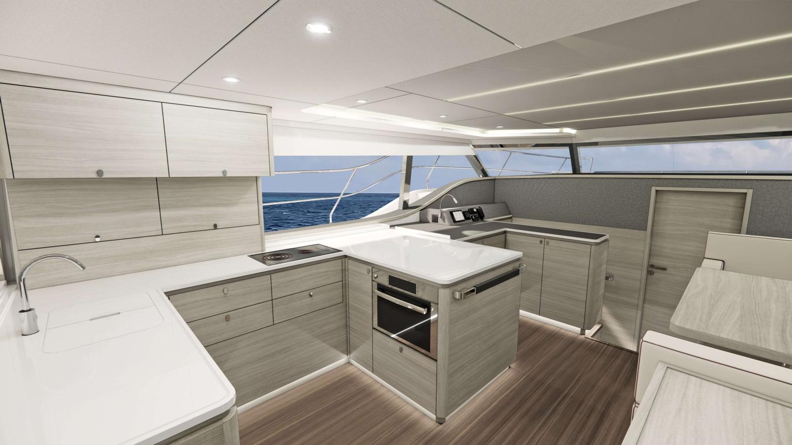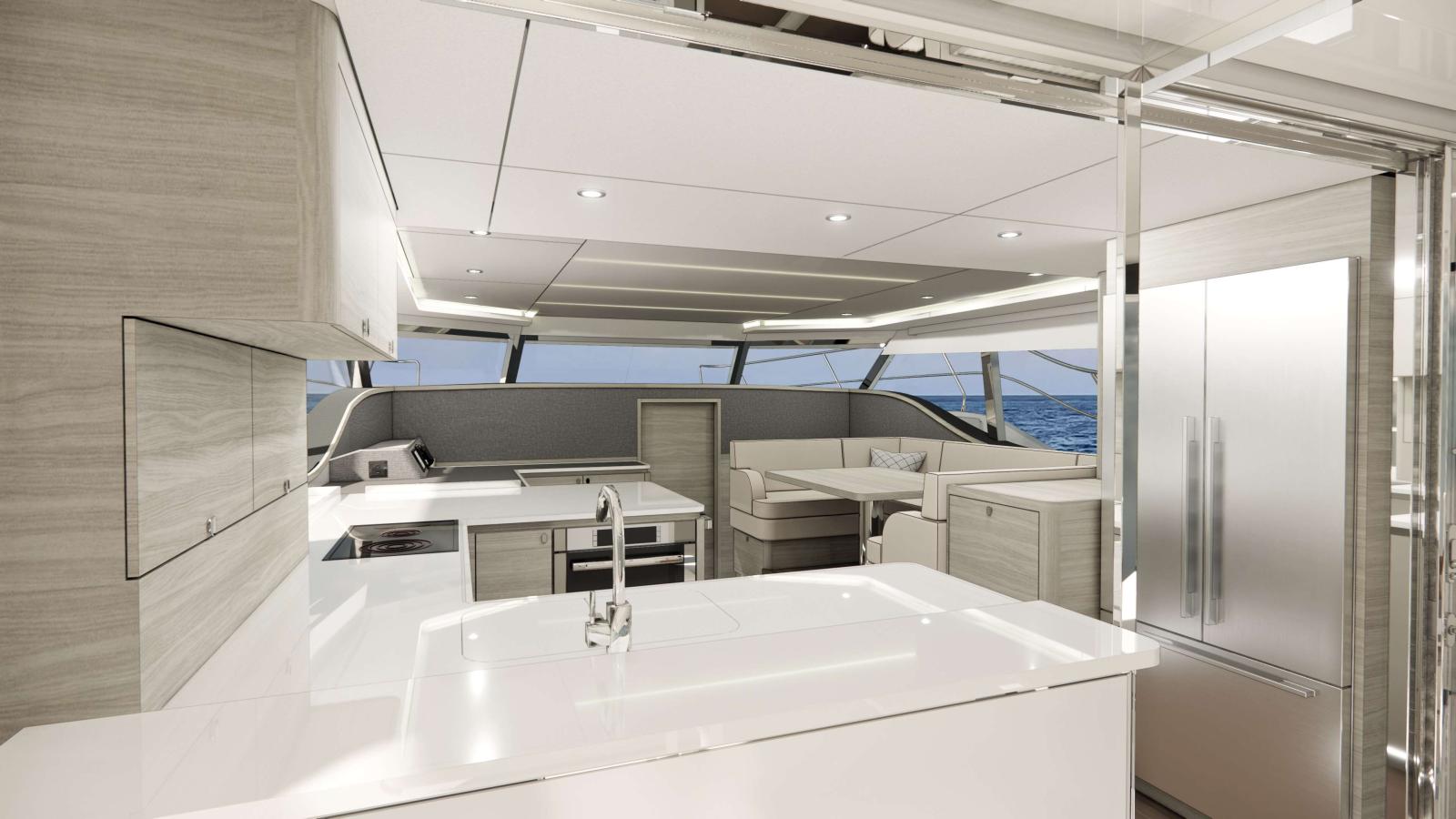 À bord, les aménagements sont à la hauteur des attentes des plaisanciers les plus exigeants. Le yacht propose jusqu’à trois cabines avec salle de bain privative, dans une atmosphère à la fois lumineuse, chaleureuse et moderne. Le salon panoramique et la cuisine ouverte favorisent la vie à bord, avec une fluidité parfaite entre les espaces.