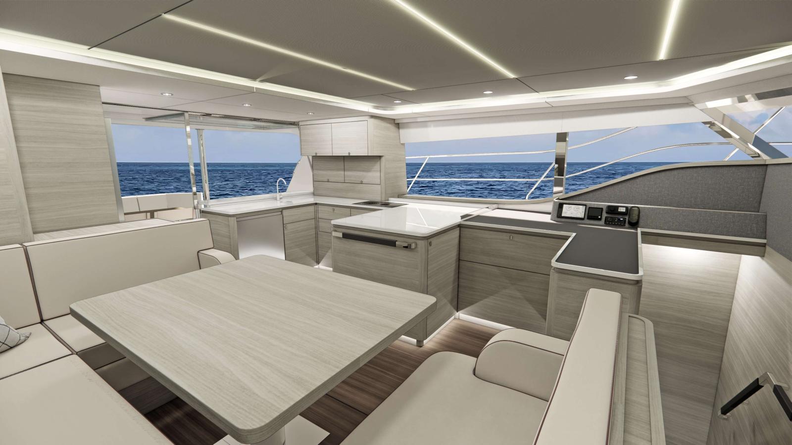 - Flybridge spacieux avec poste de pilotage central, coin repas, bain de soleil et bar