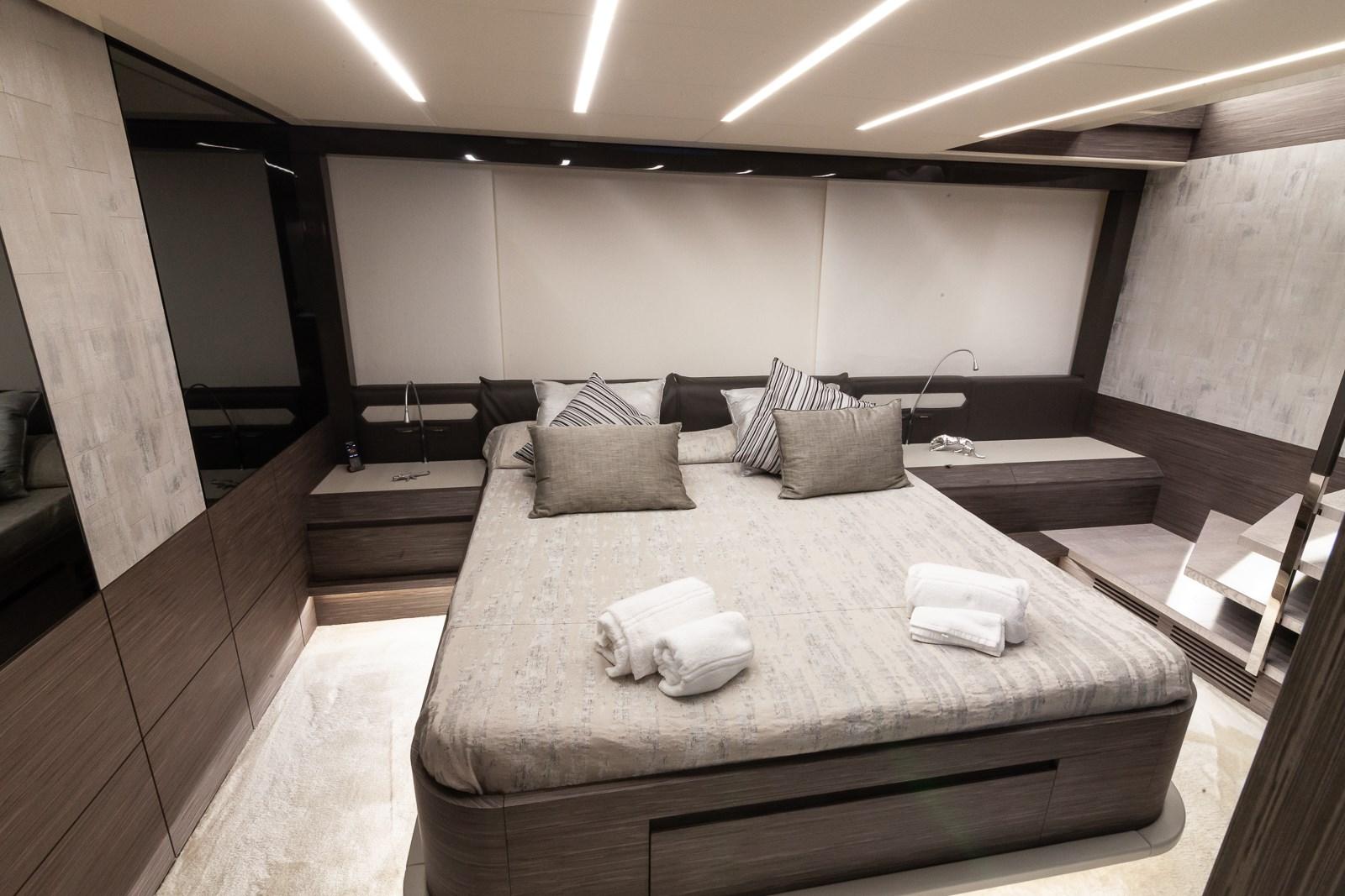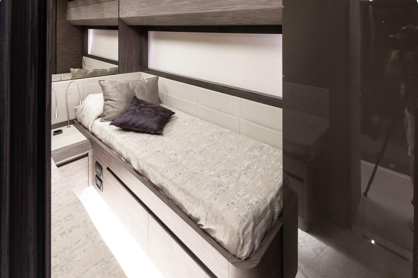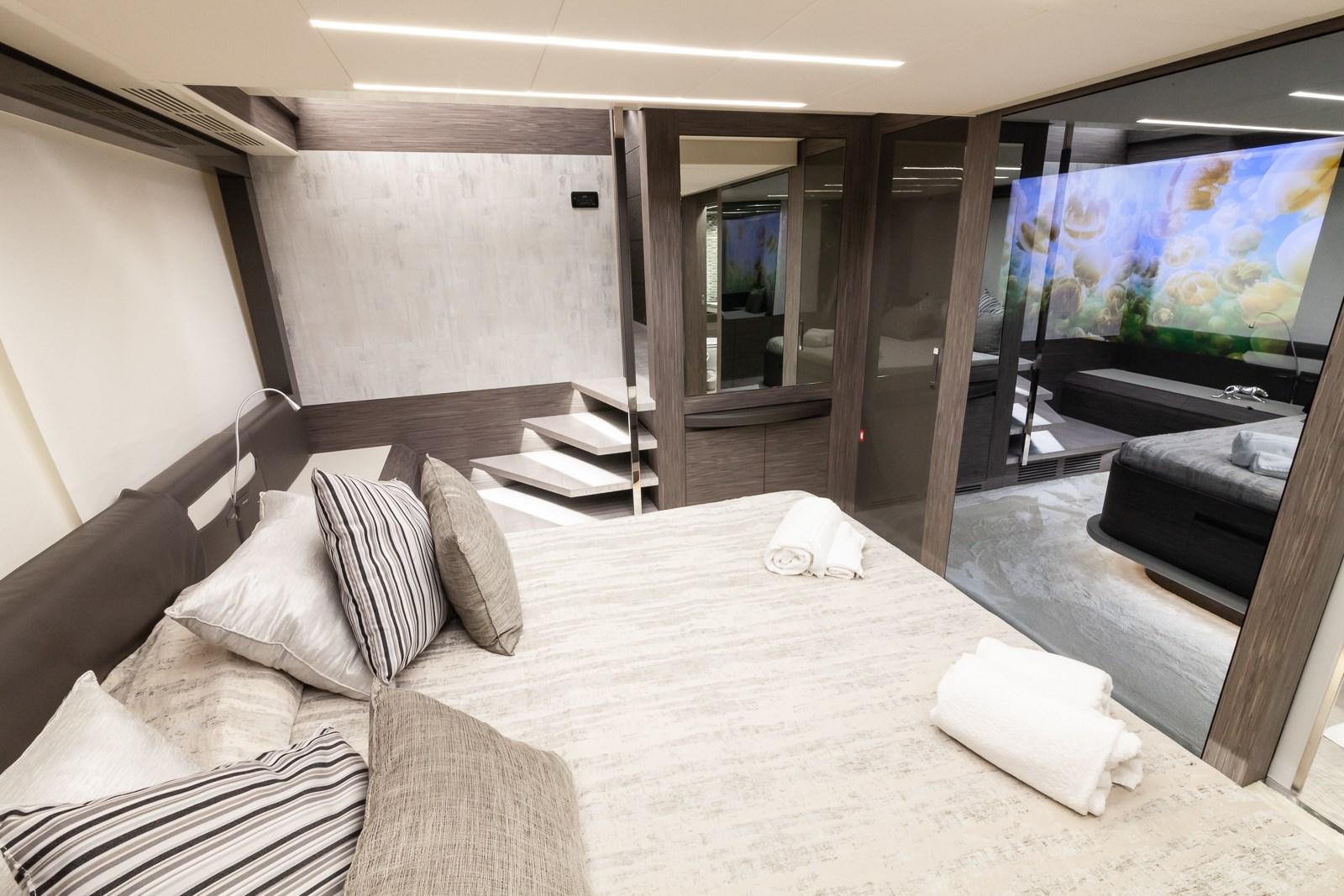 Cabine principale : remplacement de la porte vitrée d’origine de la salle de bain et création d’une cloison qui abrite la nouvelle porte coulissante de la salle de bain et la plus grande télévision qui se trouve devant le lit et positionnée à l’intérieur d’un miroir (télévision miroir)