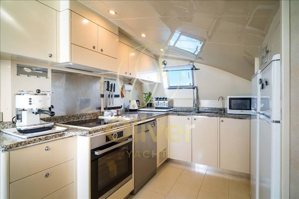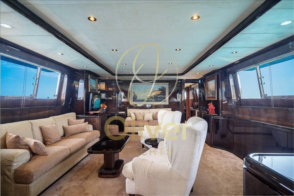En entrant dans le salon principal immédiatement à tribord, nous trouvons l’escalier d’accès à la salle des machines centrale et aux deux cabines d’invités arrière. Dans le salon, il y a une petite table basse avec un clavier électronique intégré à la console. Vers la proue, il y a deux canapés avec des tables et des fauteuils et une grande télévision. Vers la proue en passant par le couloir sur la gauche, il y a l’escalier pour monter d’abord au pont puis au flybridge, tandis qu’en allant plus loin il y a la salle à manger avec une table confortable pour 10 personnes et l’escalier pour accéder au pont inférieur où se trouvent la cabine principale et la cabine VIP. De ce salon, on accède à la grande cuisine et les cabines de l’équipage sont situées à l’avant.