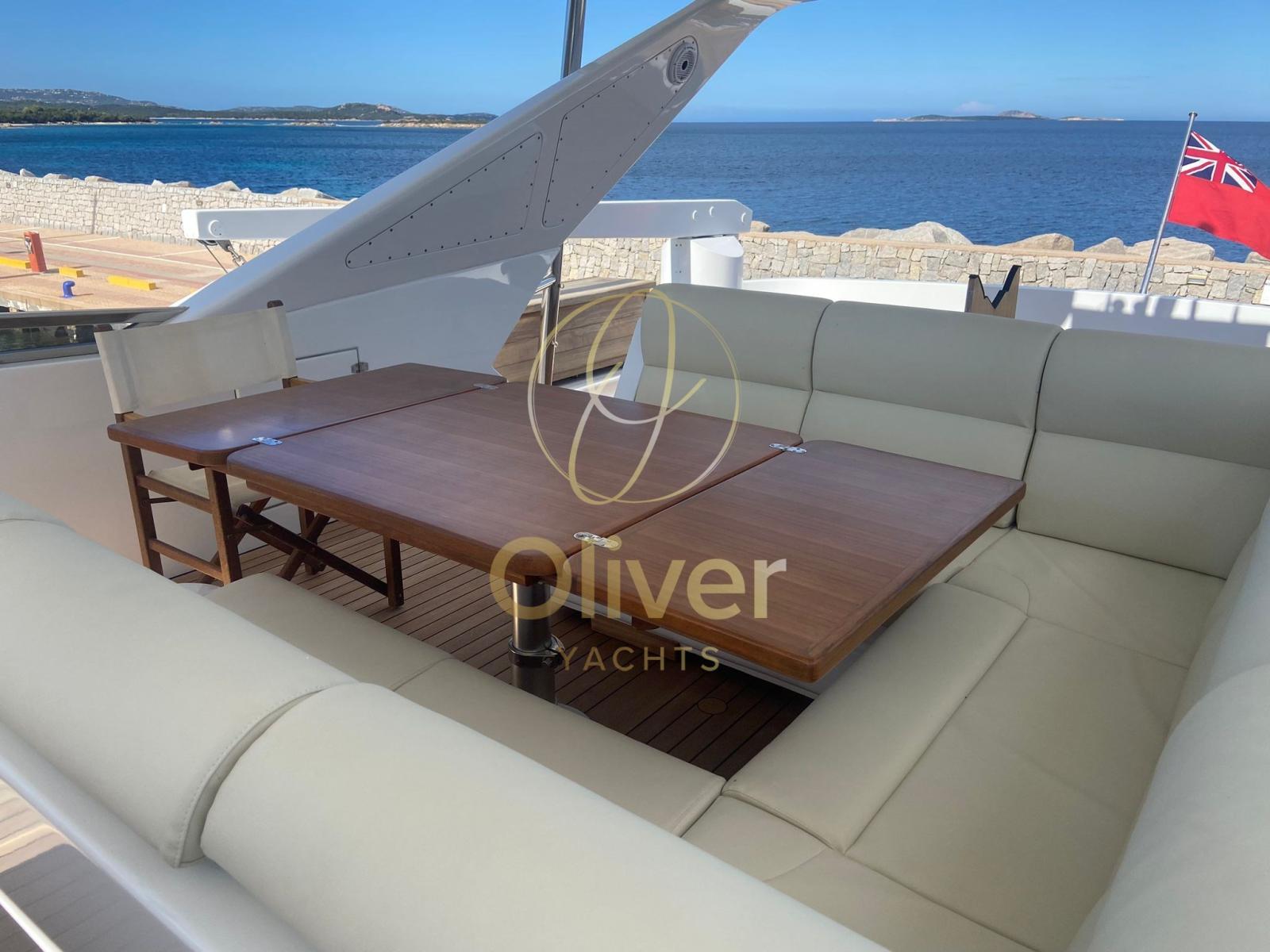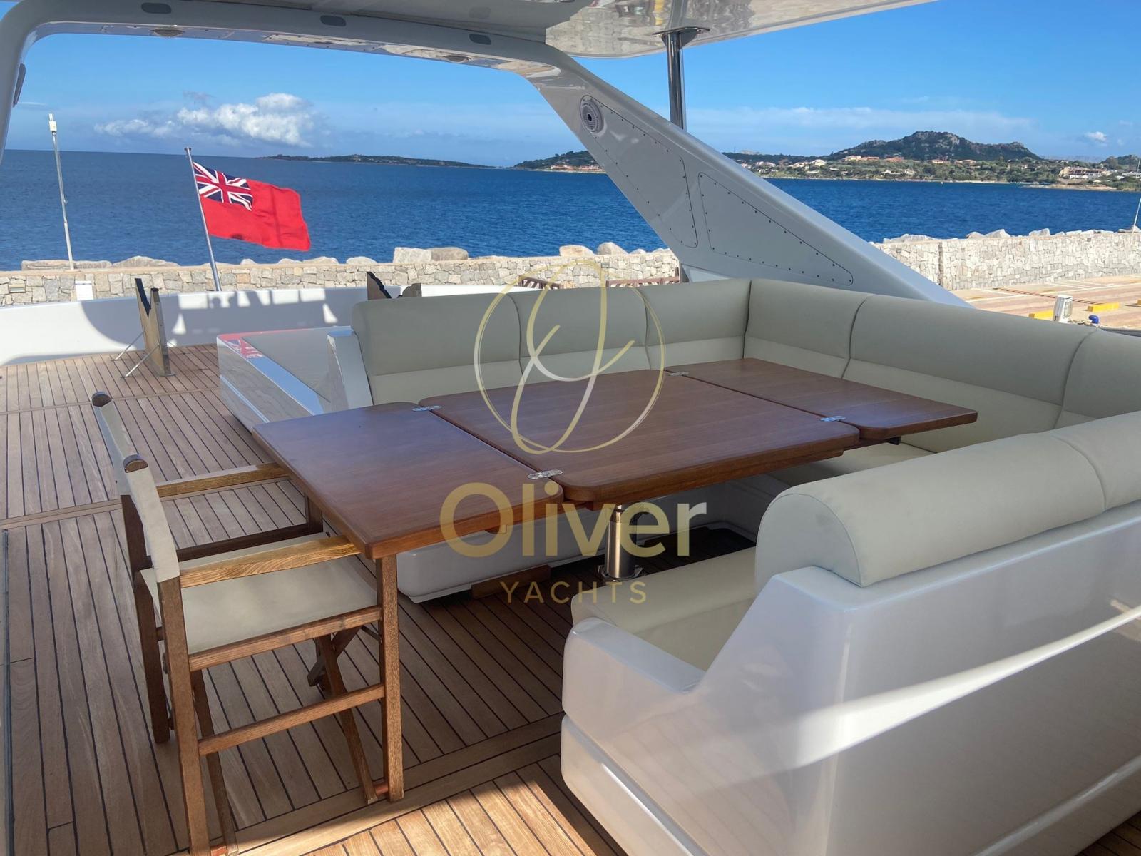 Alarme gaz, Alarme moteur, Alarme de pompe de cale, Eau sous pression, 10 Batteries, Système de vidange, Passavant en teck, Douche de cockpit, Double barre à roue, Phares fixes arrière, Phare de poursuite, Flaps hydrauliques, Bossoirs pour annexe, Grue de flybridge, Hard top, Extincteur(s) fixe(s), Indicateurs de flaps, Lavabo dans le cockpit, Éclairage de courtoisie, Jet-ski, Passerelle (poppiera Besenzoni), Plateforme arrière, Pompe de cale automatique, Pompe de cale manuelle, Porte latérale, Porte latérale, Cockpit en teck, Prise de quai, Connexion eau sous pression à quai, Guindeau Hydraulique, Selles pour Annexe, Stabilisateurs (Zero speed), table de cockpit, Annexe, Filières avec sortie latèrale, Corne, T-Top, Winch électrique arrière, Winch électrique avant.