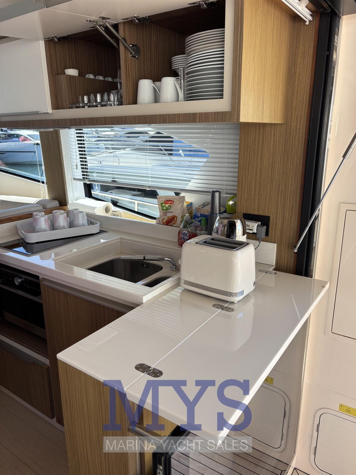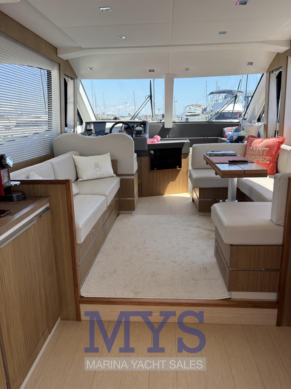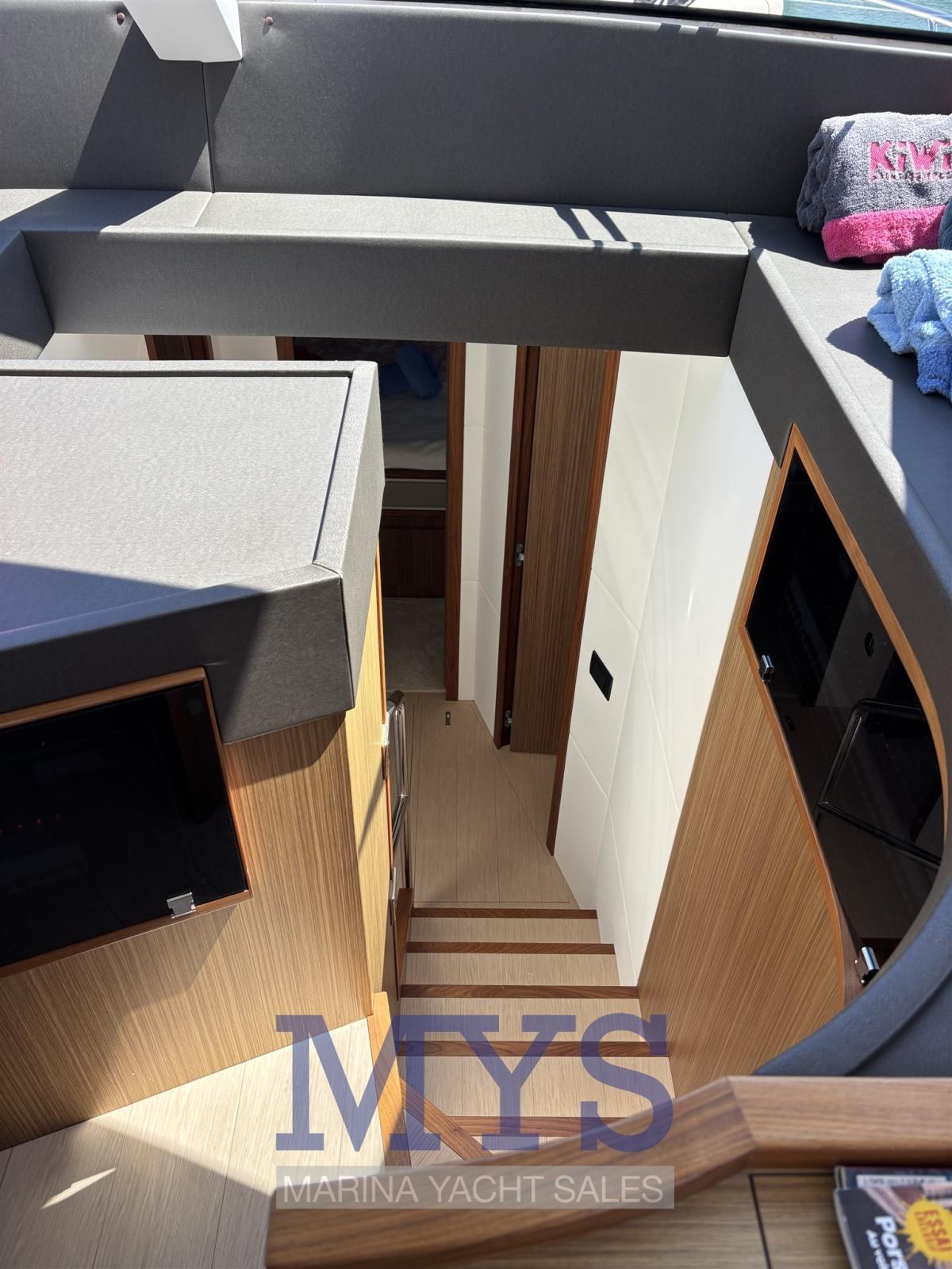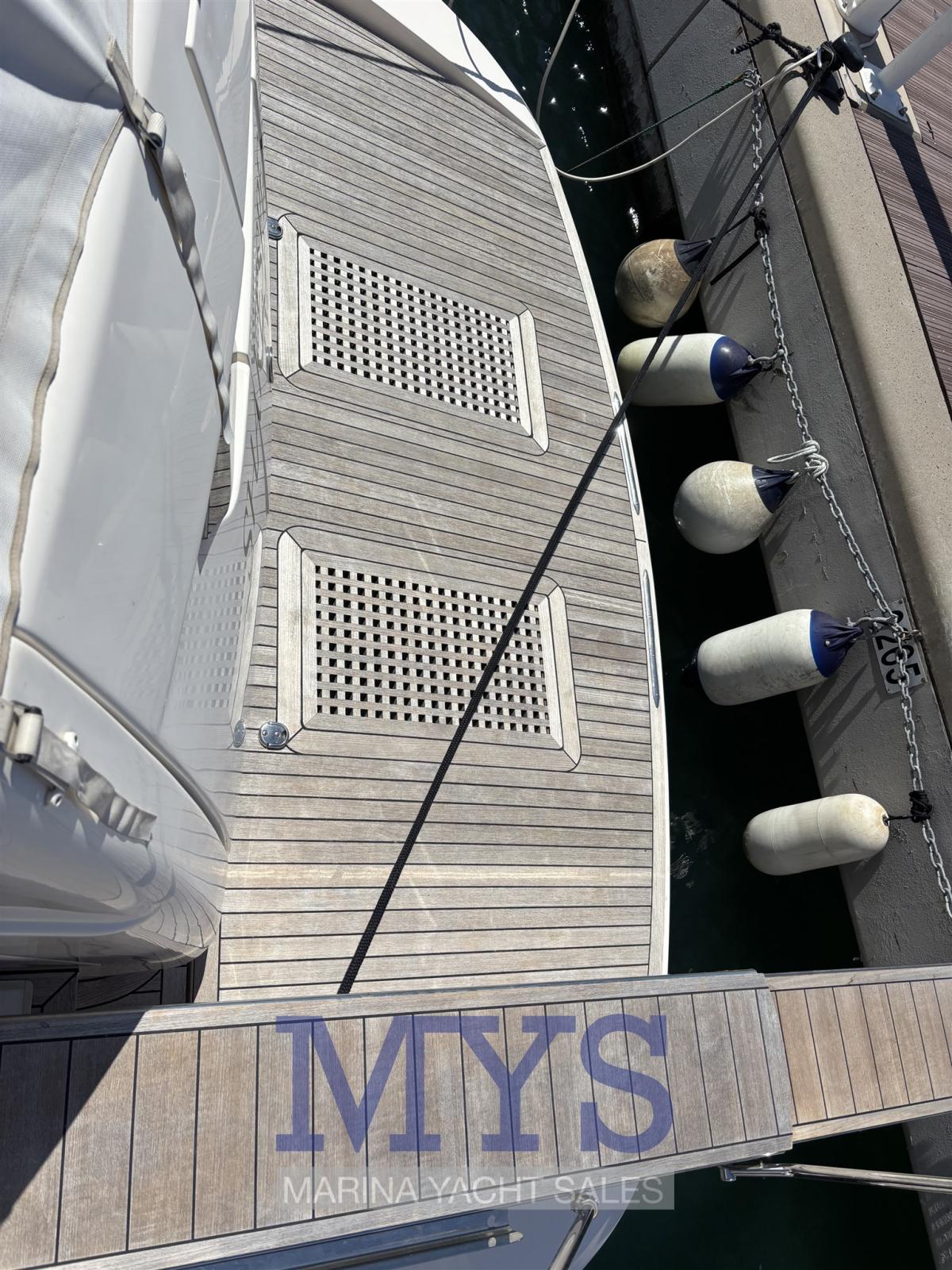 Alarme moteur, Alternateur, Aspiration des Eaux Usées depuis le Pont, Auto Dynamic Trim Interceptor, Eau sous pression, Passavant en teck, Câble d’alimentation à quai, Filères, Douche de cockpit, Double barre à roue, Phare de poursuite, Flaps électriques, Extincteur(s) fixe(s), Indicateurs de flaps, Éclairage de courtoisie, Spots sous-marins, Défenses, Passerelle, Plateforme arrière, Pompe de cale automatique, Porte latérale, Cockpit en teck, Prise de quai, Répétiteur électronique, Rollbar, Guindeau électrique, Echelle de bain, table de cockpit, Table pliante de salon, Corne, Winch électrique arrière.