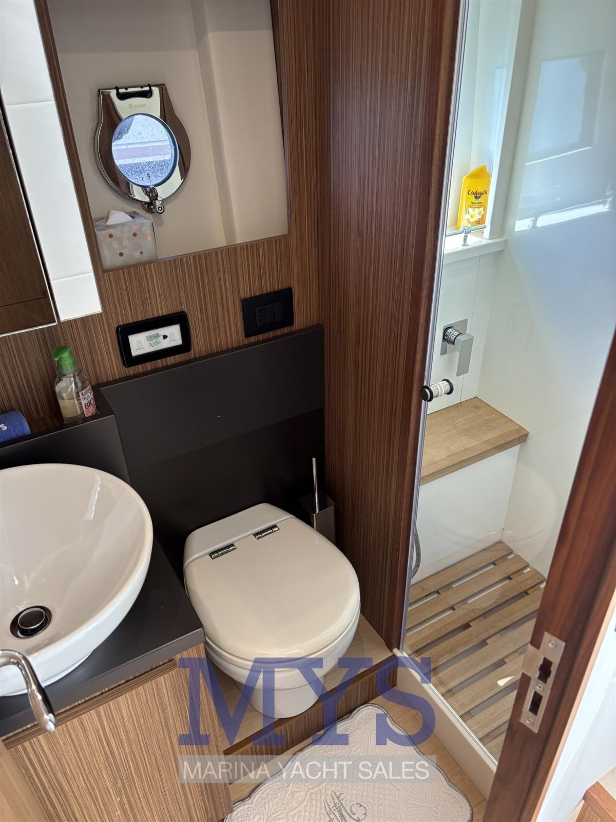 1 cabine double principale arrière pleine largeur avec salle de bain complète avec lavabo, douche et WC marins électriques
