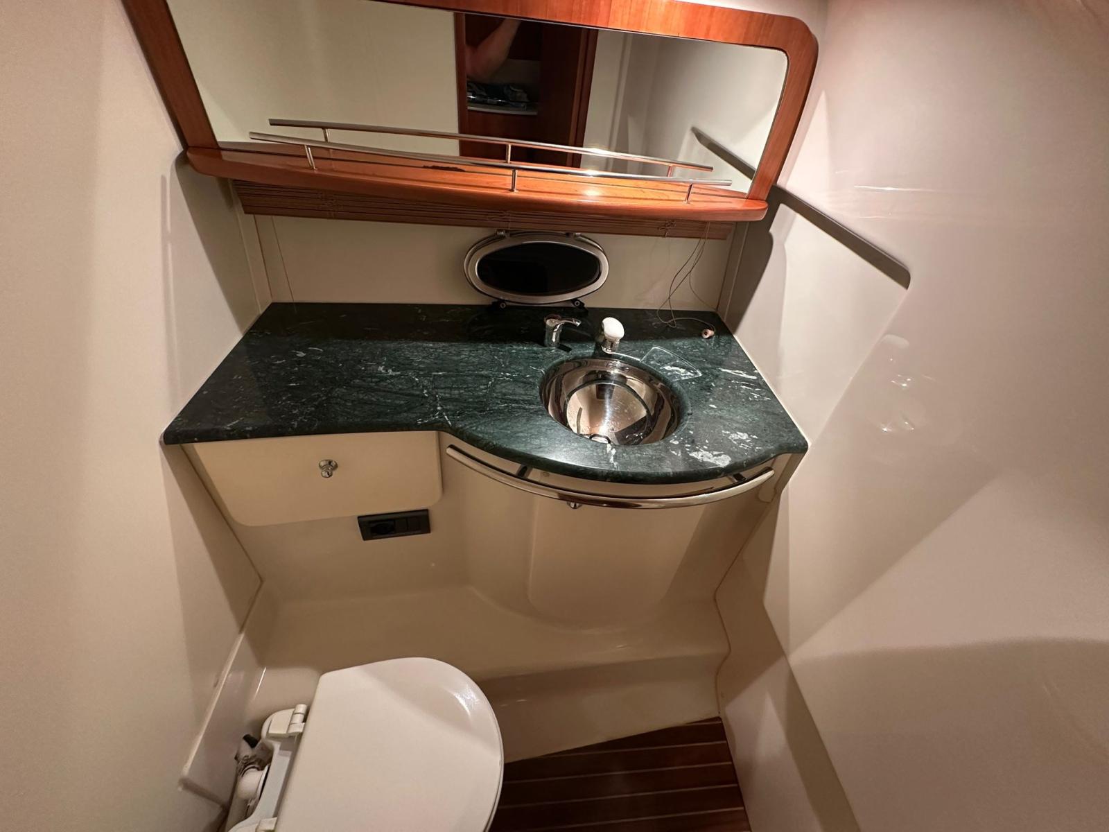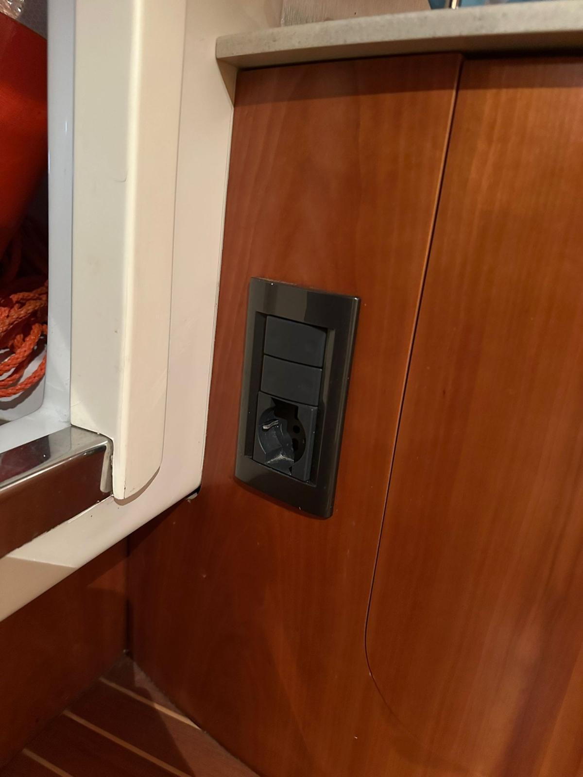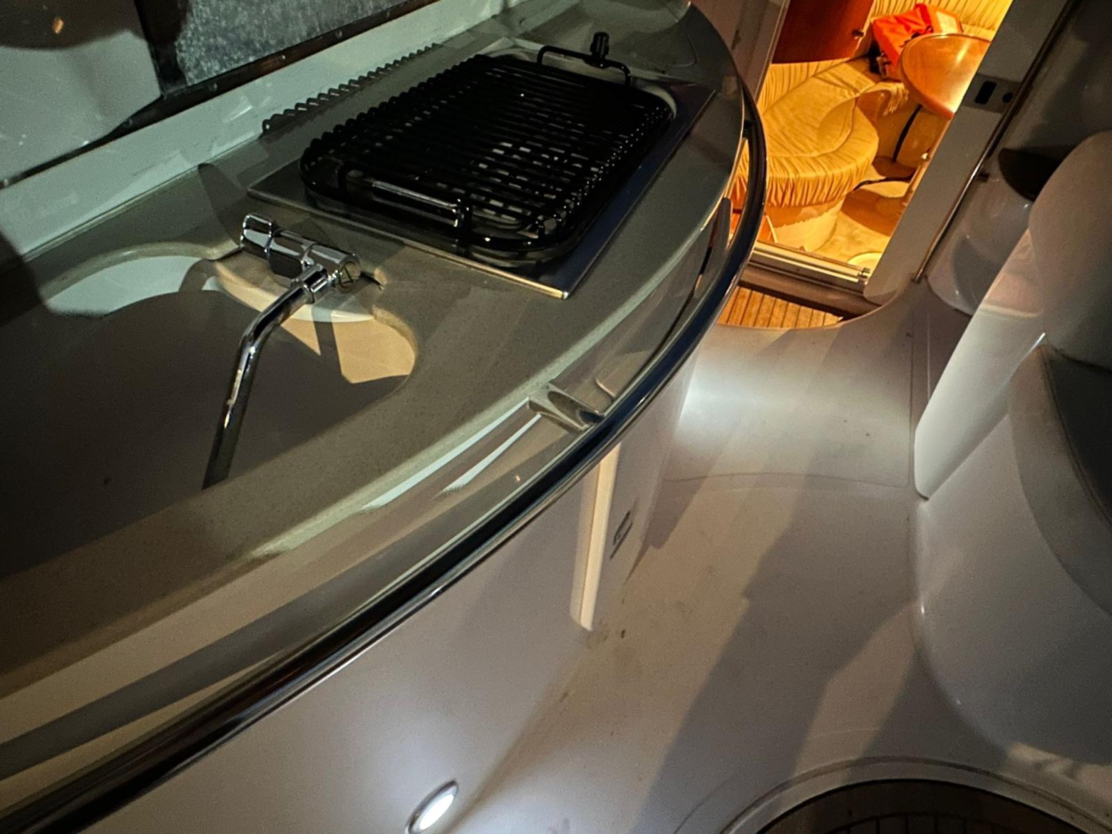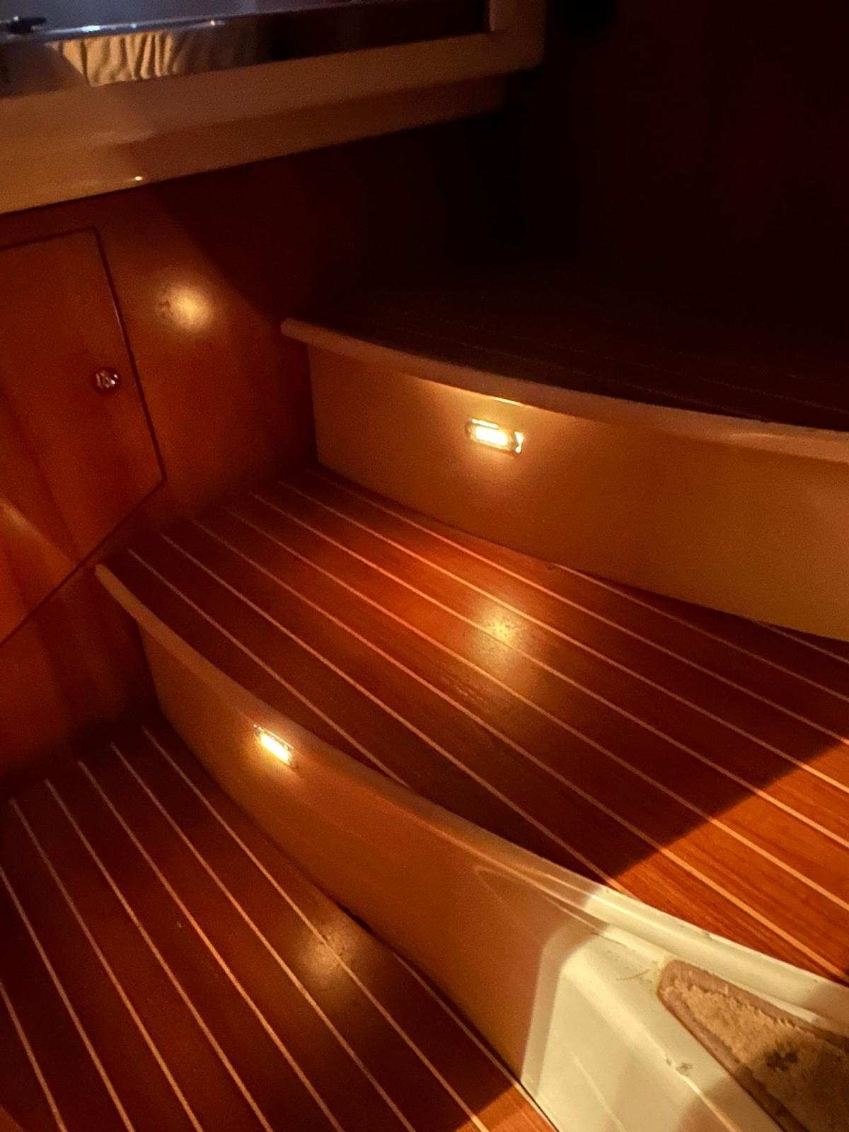 Flaps hydrauliques (N°2), Lavabo dans le cockpit, Pompe de cale automatique, Cockpit en teck, Prise de quai, Guindeau électrique, Echelle de bain, table de cockpit.