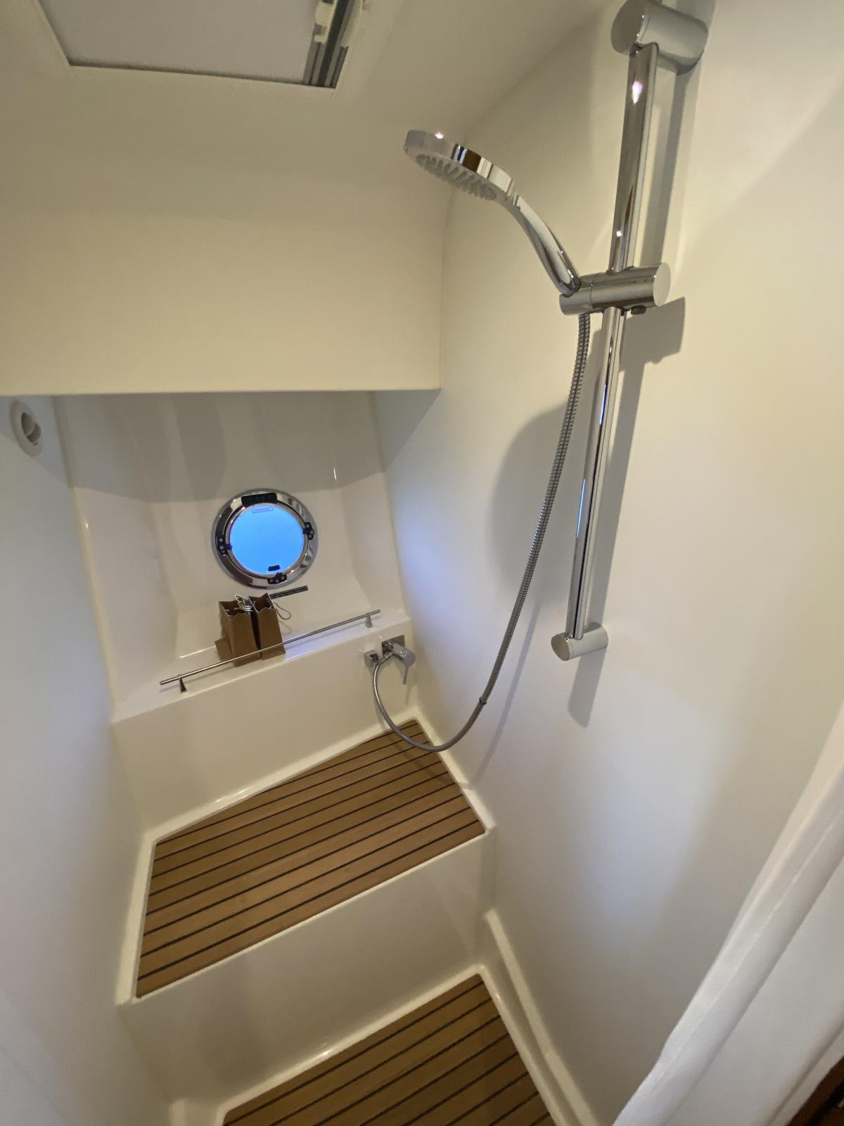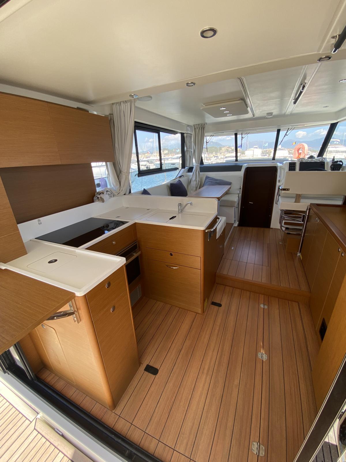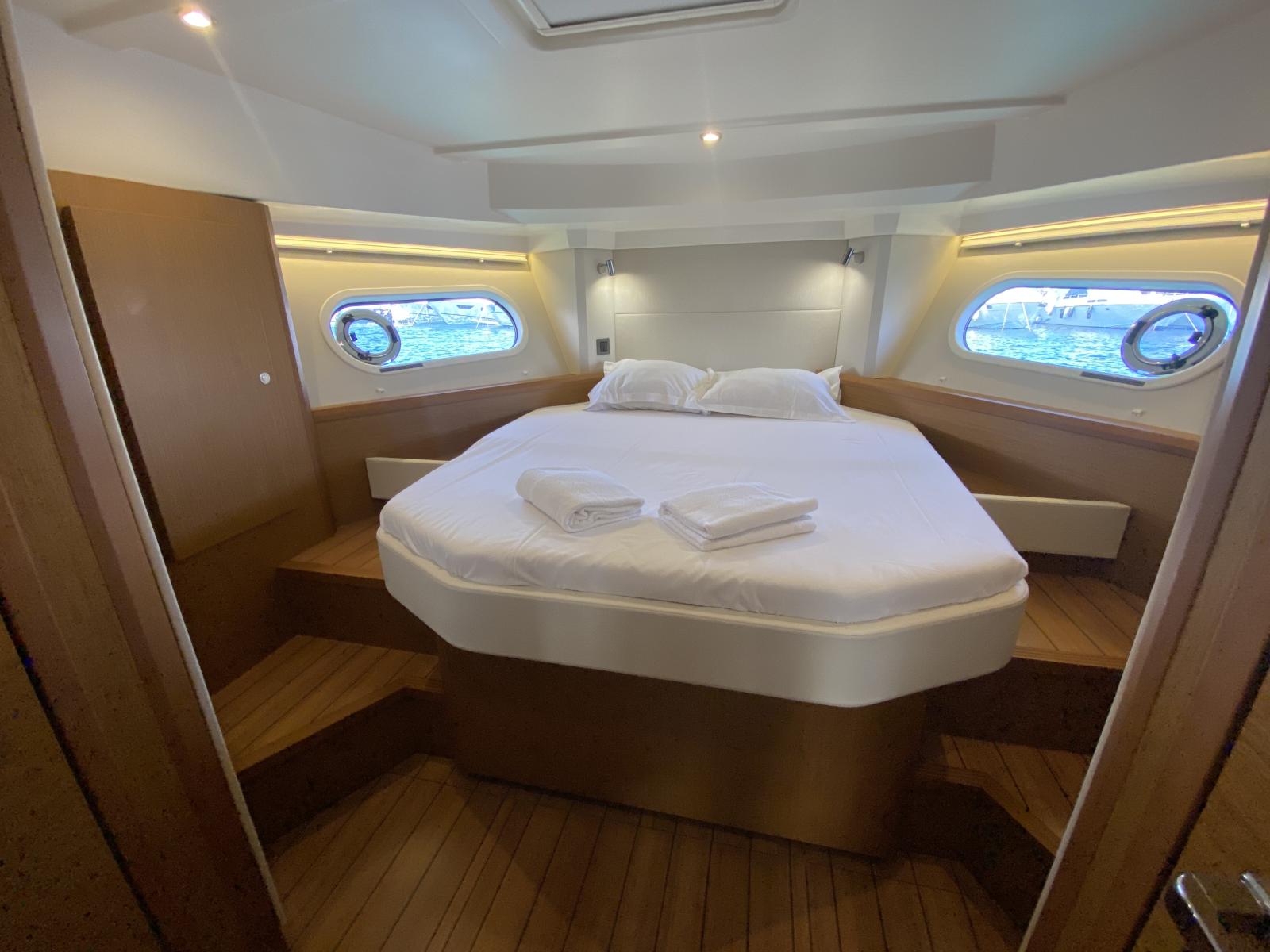 Le bateau est motorisé en Volvo Penta D4 2X270, version 3 cabines et deux salles d'eau Alpi noyer.