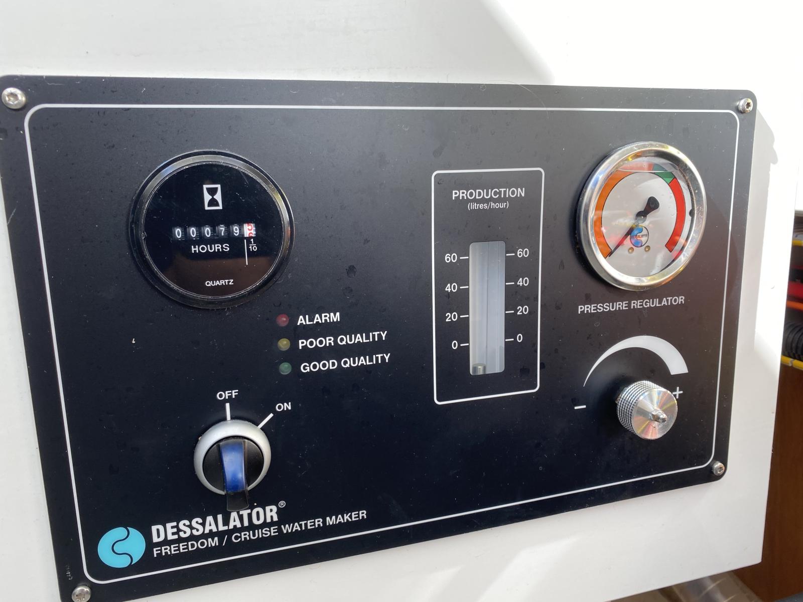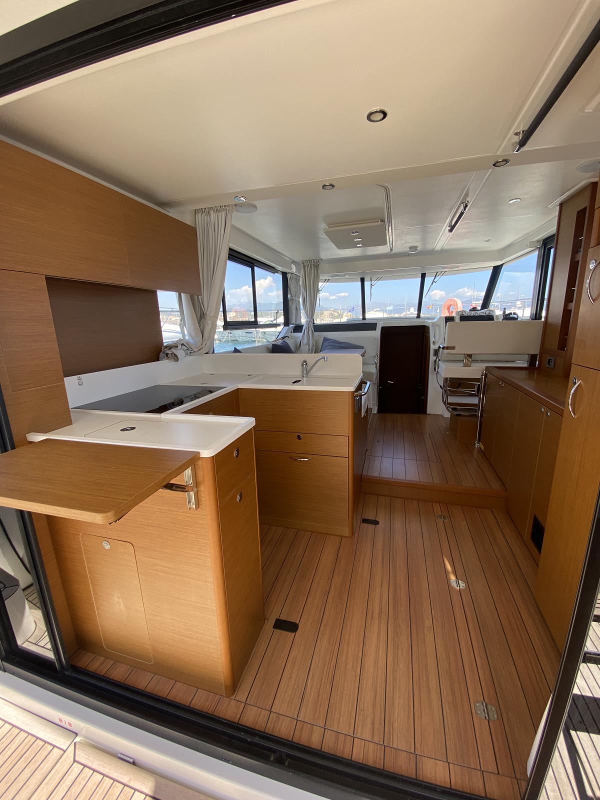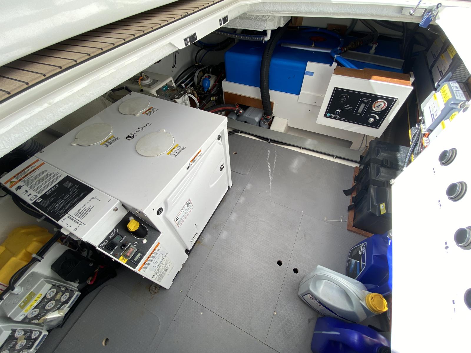 Le bateau est motorisé en Volvo Penta D4 2X270, version 3 cabines et deux salles d'eau Alpi noyer.