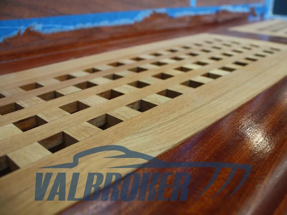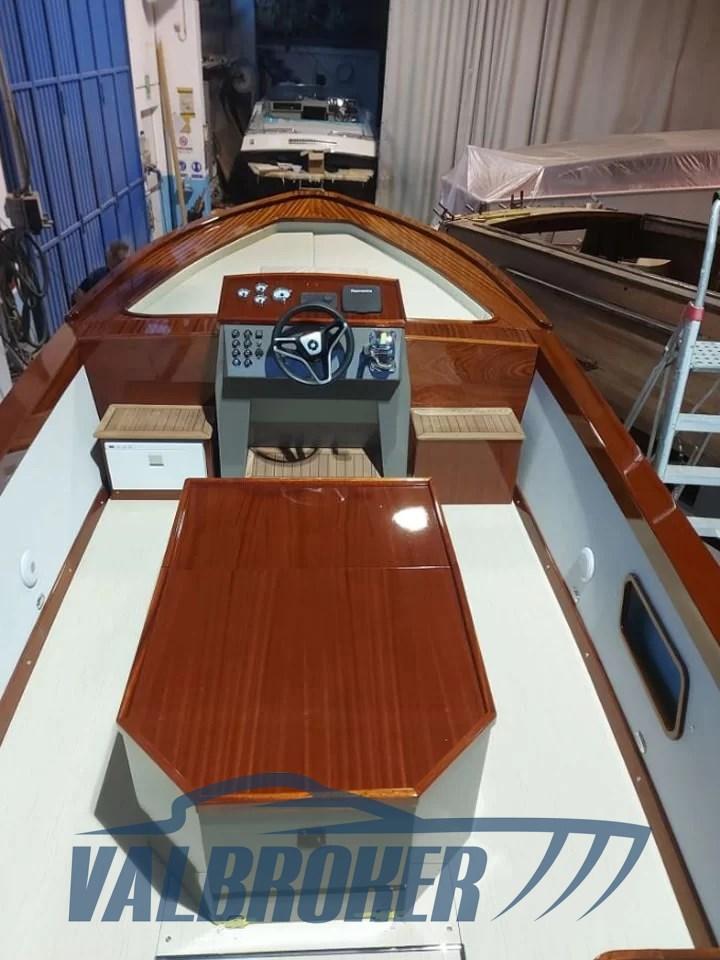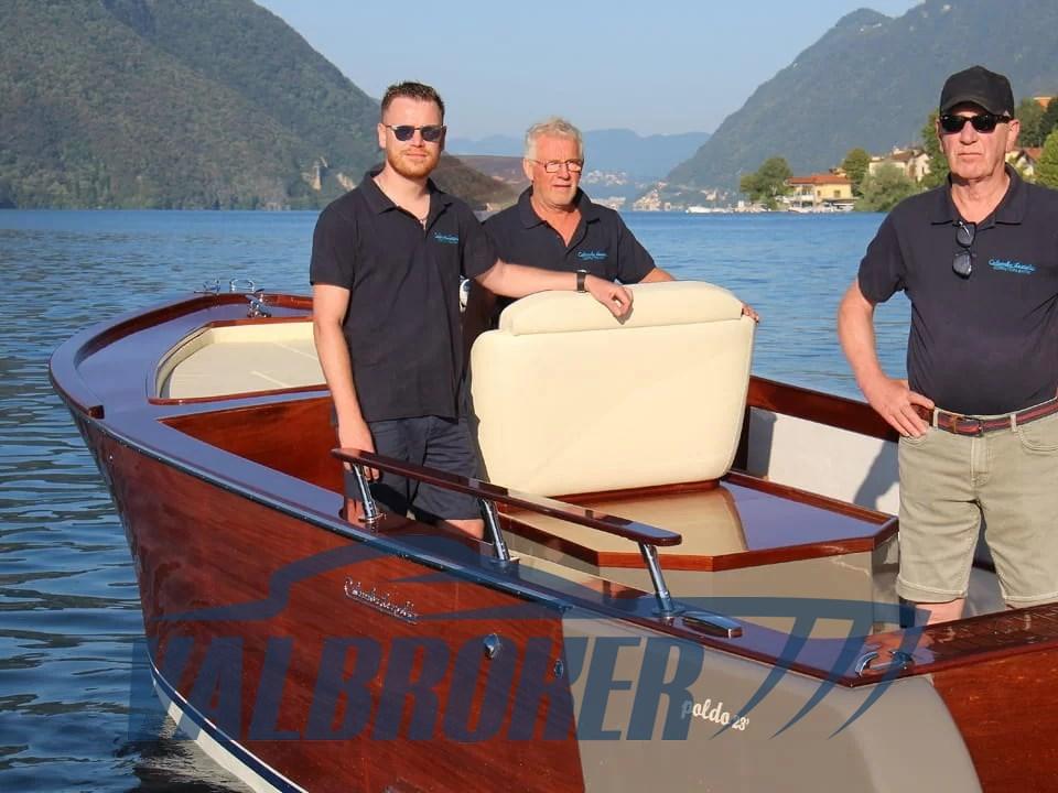 BATEAU NEUF. Poldo 23, le bateau du 70e anniversaire, construit en acajou, chêne et iroko. Équipé d’un moteur diesel in-bord et d’une transmission par axe. Le grand bain de soleil à l’avant, le poste de pilotage avec strapontin pour la conduite debout, le compartiment moteur central, les sièges arrière avec le canapé en forme de « U » et enfin la plate-forme de bain avec grille en teck. Les coussins du bain de soleil avant cachent un grand coffre pour le rangement des gilets de sauvetage et du matériel, qui peut devenir une couchette d’urgence si nécessaire. On y accède par deux marches sur les côtés du tableau de bord. La console est équipée d’instruments de navigation classiques, notamment le tachymètre, le niveau de carburant, la pression d’huile, le compteur d’entretien numérique. Deux batteries de 80 Ah fournissent chacune de l’énergie pour le moteur et les services.