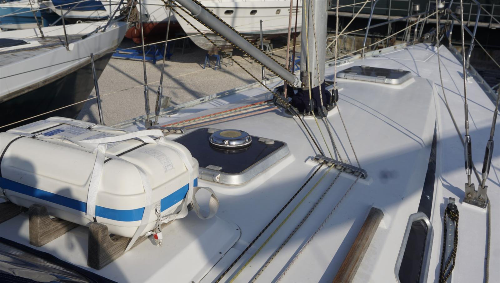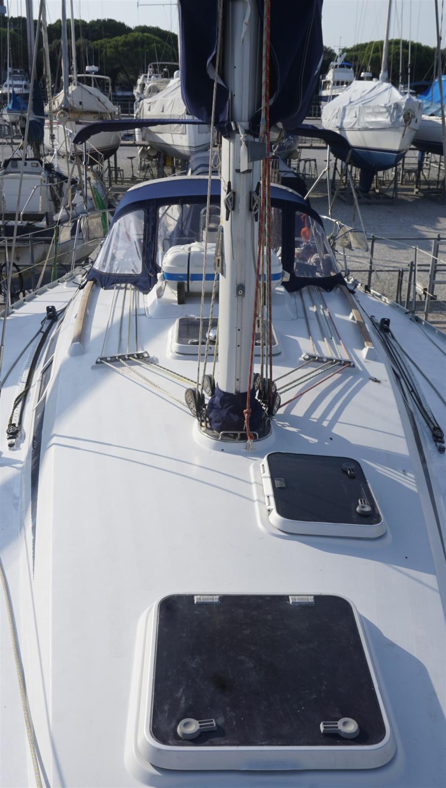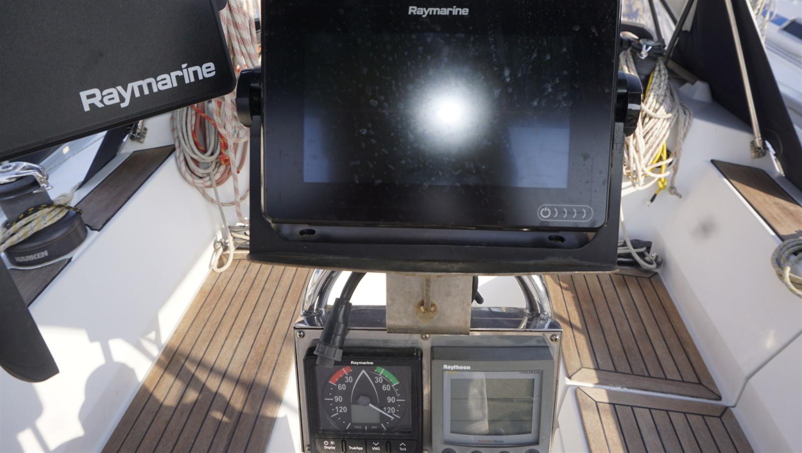 Ancre (15 kg + spare, 50 m chain), Eau sous pression, Câble d’alimentation à quai, Douche de cockpit, Panneau solaire, Passerelle, Pompe de cale manuelle, Cockpit en teck, Prise de quai, Guindeau électrique, Echelle de bain, table de cockpit, Winch (HARKEN), Windex.