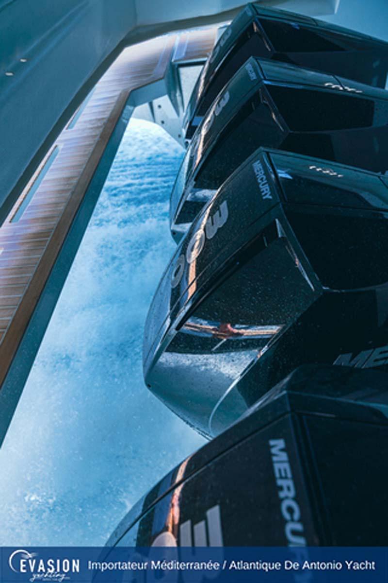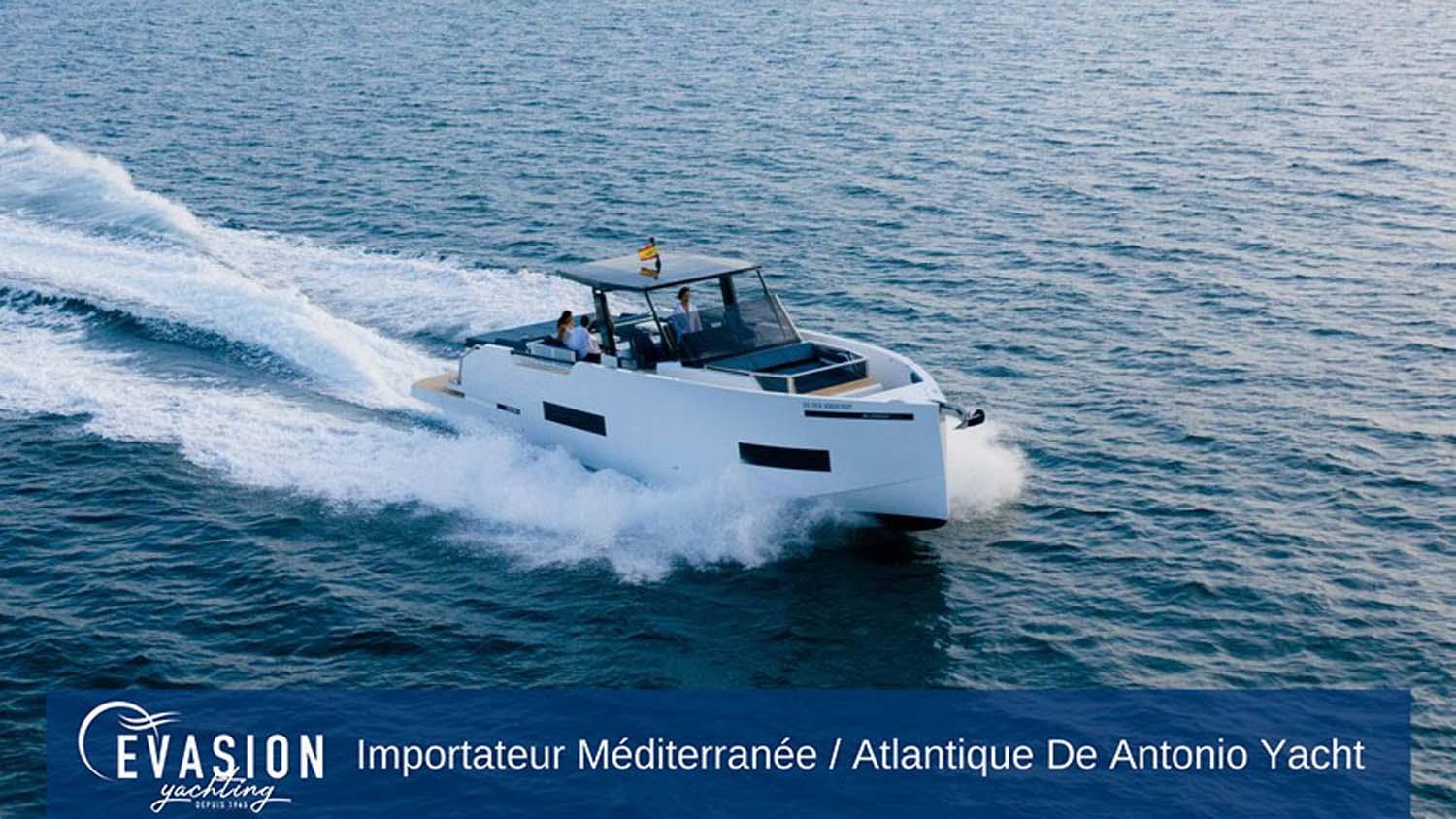 EVASION YACHTING, importateur pour une grande partie de la Méditerranée et l'Atlantique pour DE ANTONIO YACHTS, vous invite à venir découvrir le DE ANTONIO D50 Open NEUF, triple ou quadruple motorisation essence, sur commande.