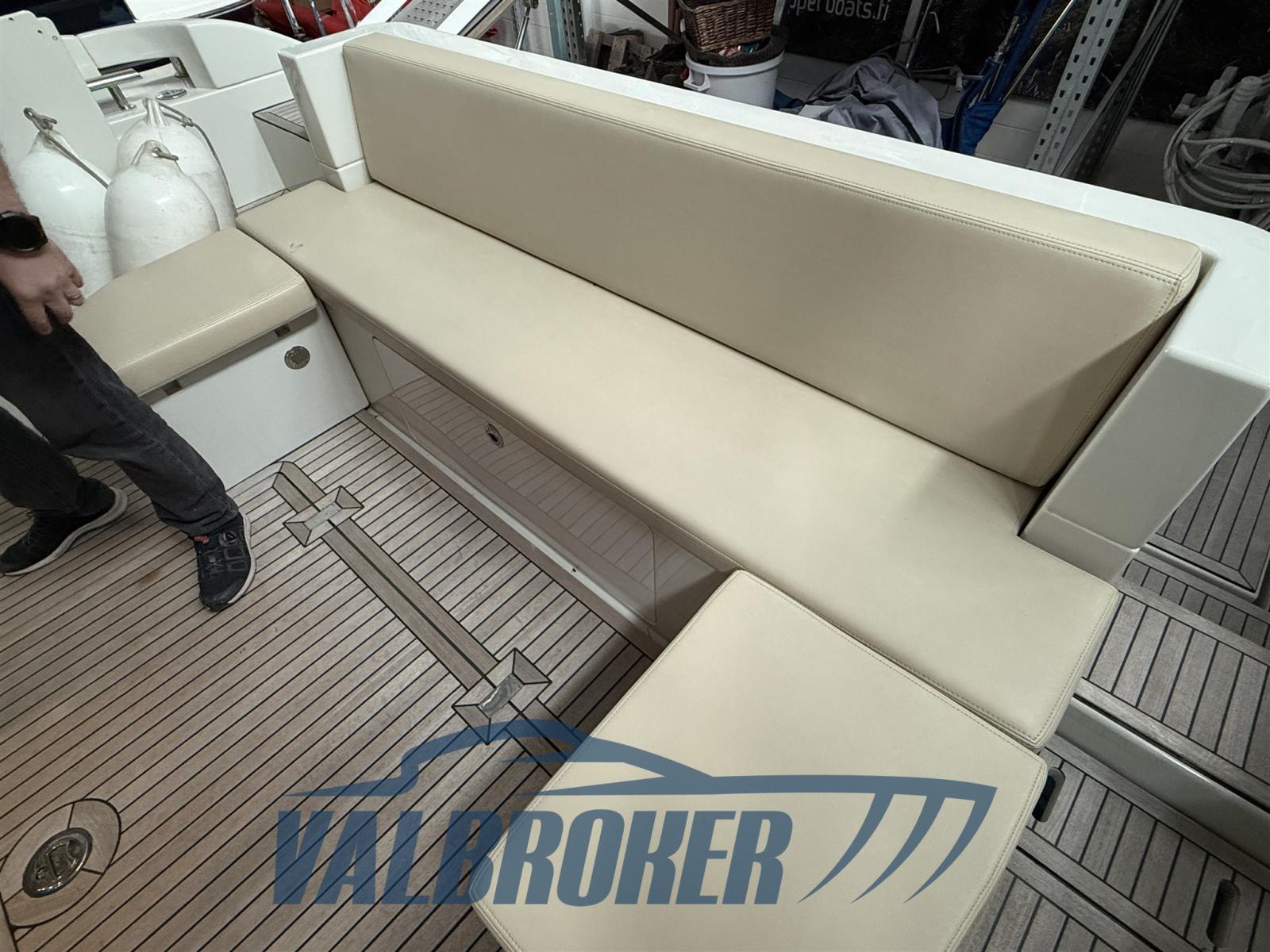 Eau sous pression, Douche de cockpit, Flaps hydrauliques, Spots sous-marins, Passerelle (teak, telescopica elettroidraulica), Plateforme arrière (teak, elettroidraulica), Pompe de cale automatique, Cockpit en teck, Prise de quai, Guindeau électrique, Echelle de bain, Table pliante de salon.