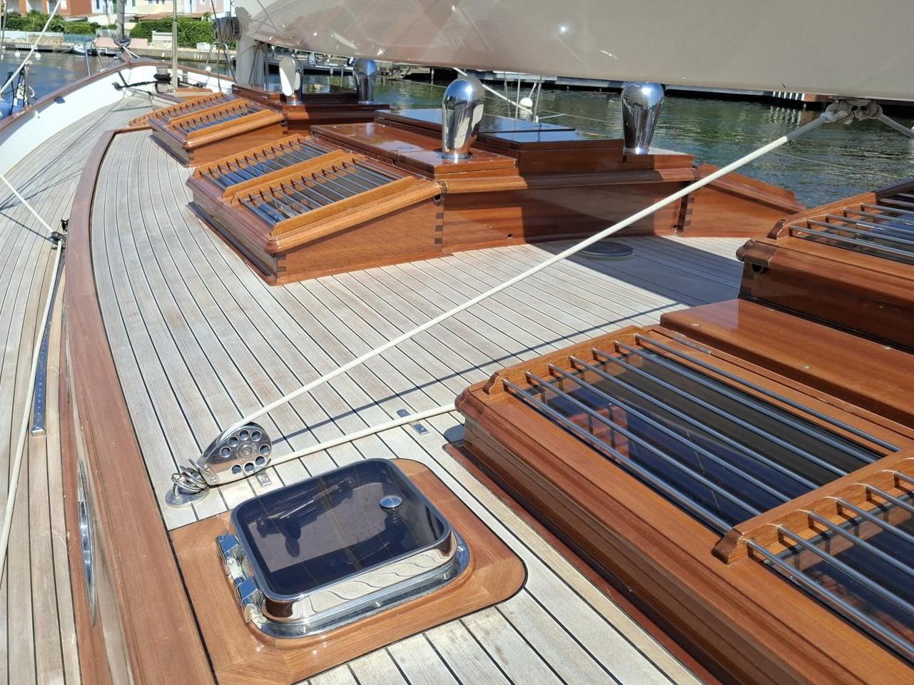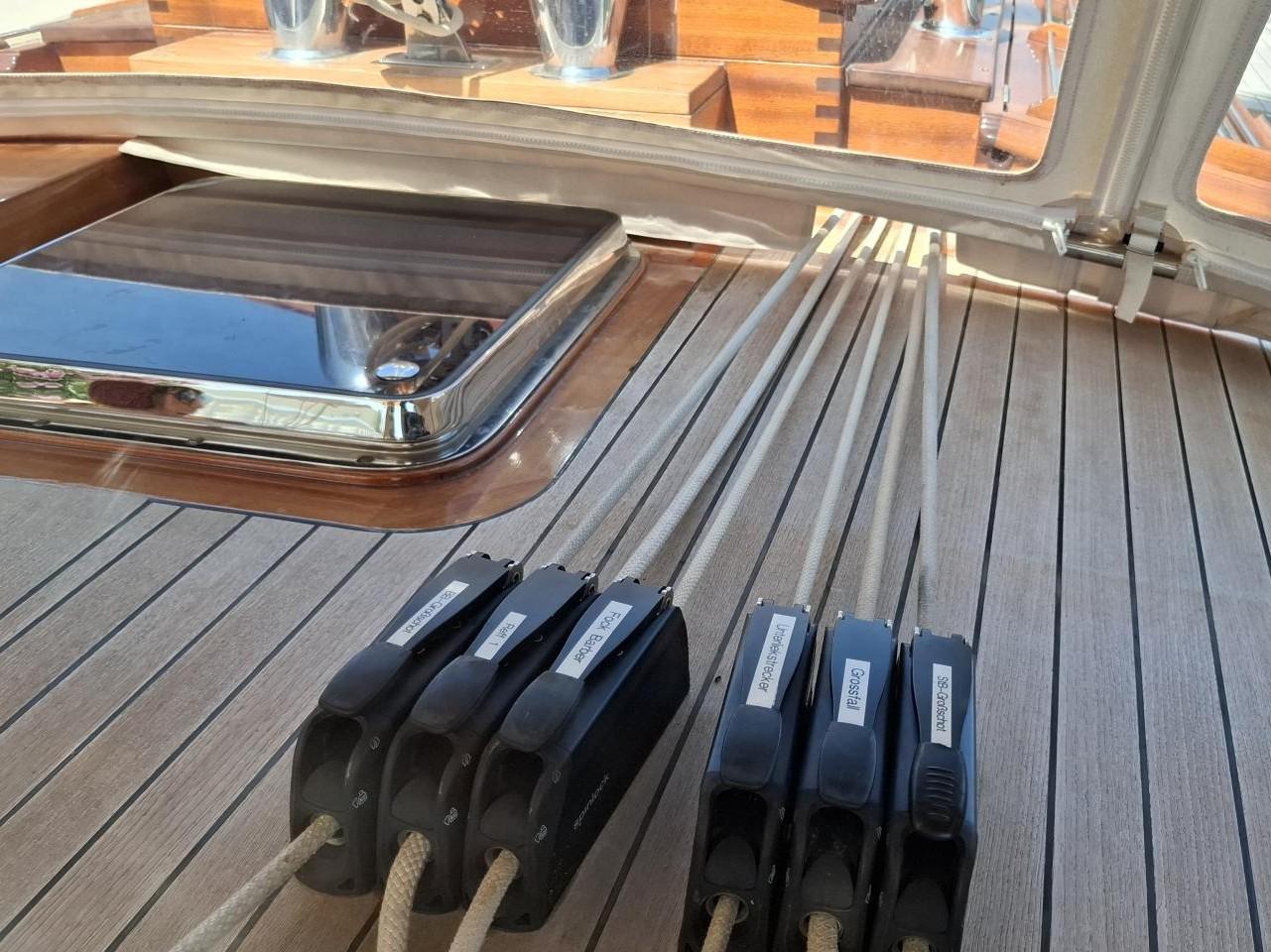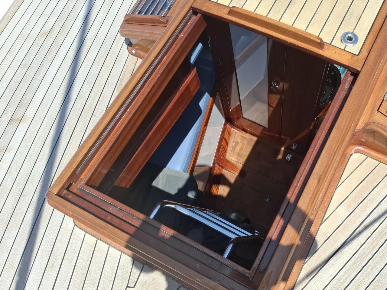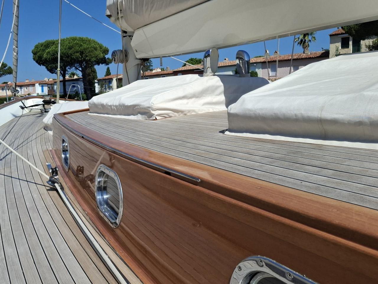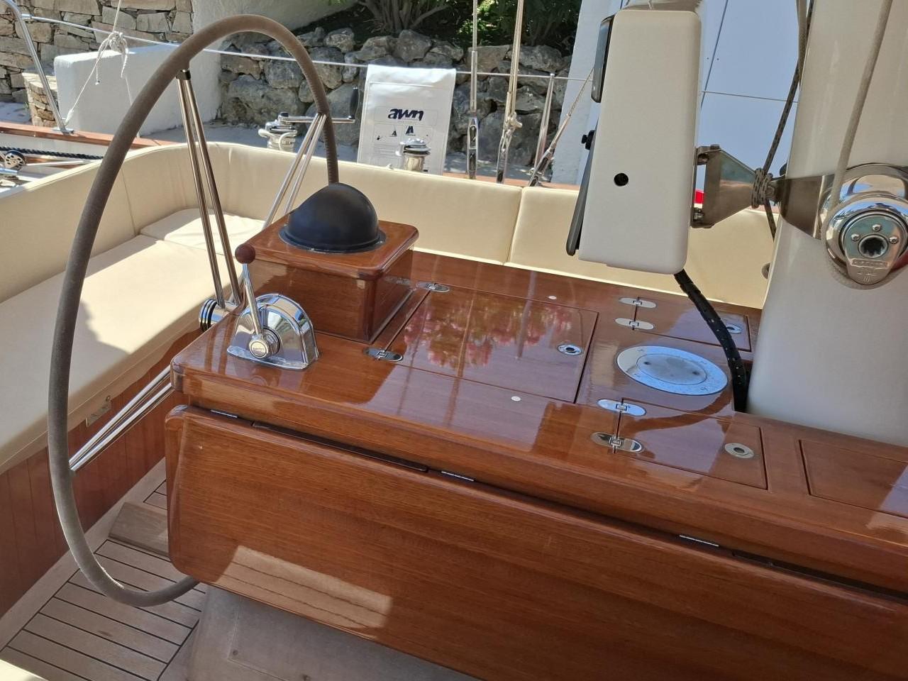 Deux guindeaux électriques Lofrans Mouillage principale ancre charrue en inox 30 kg avec 100 m de chaîne en inox Mouillage secondaire ancre charrue en inox 30 kg relié Propulseur d’étrave rétractable Max Power 24V Pont cockpit et passavant en Teck massif Quille relevable électrohydraulique, en acier haute résistance Grande table de cockpit centrale avec réfrigérateur 40 L, évier et rangements Coussins de cockpit avec dossiers Capote de roof Barre à roue avec console pour l’électronique Pour annexe gonflée 2,70 m pare-battages, passerelle Echelle de bain arrière Douche de pont