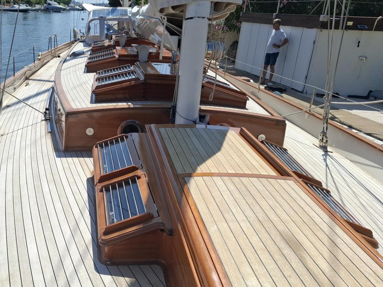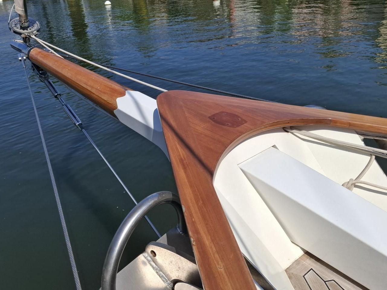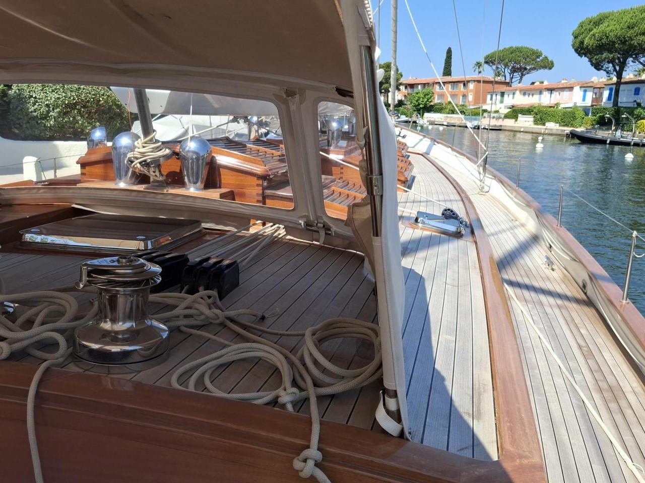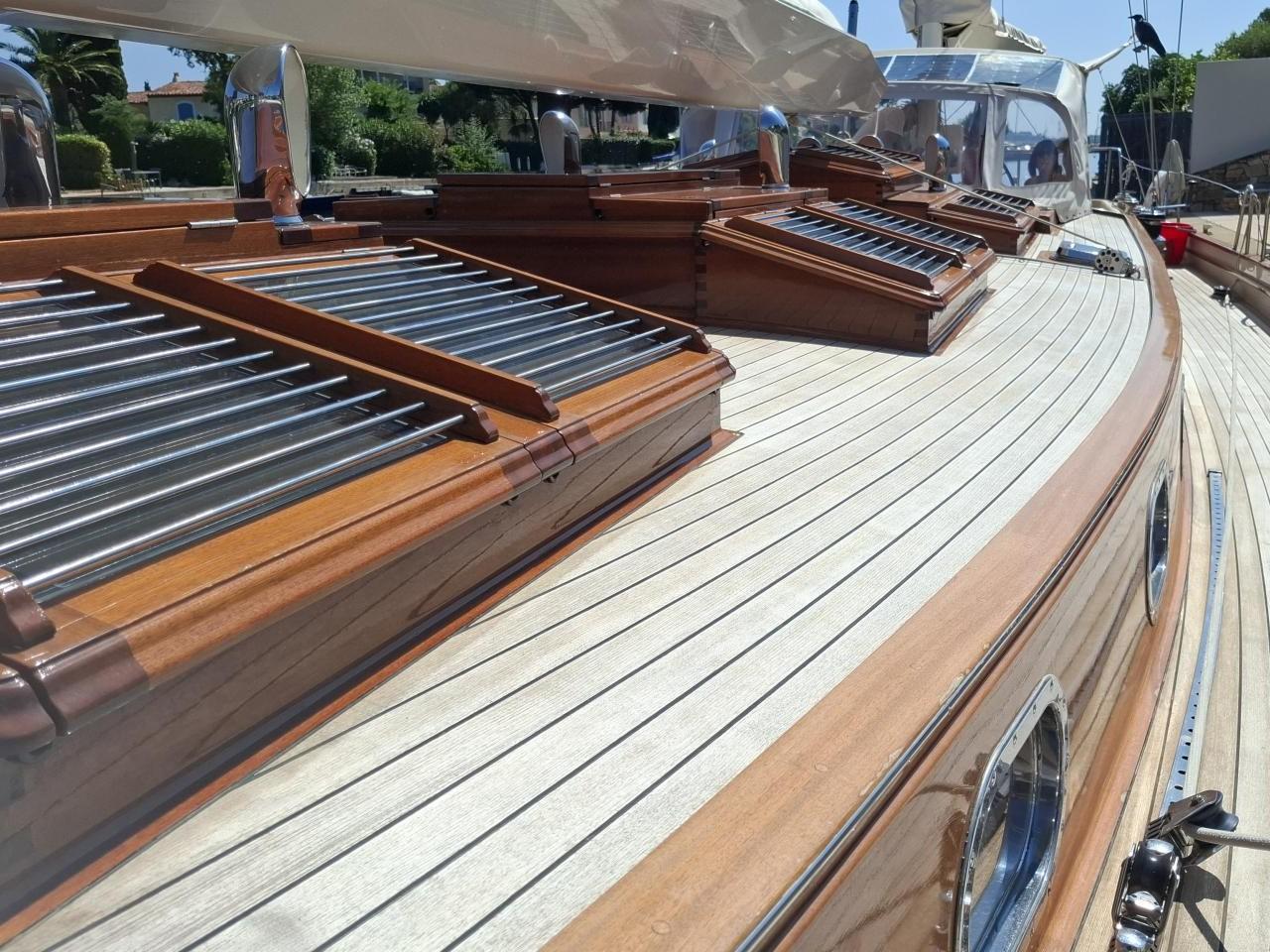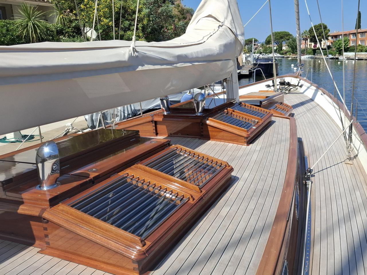 Deux guindeaux électriques Lofrans Mouillage principale ancre charrue en inox 30 kg avec 100 m de chaîne en inox Mouillage secondaire ancre charrue en inox 30 kg relié Propulseur d’étrave rétractable Max Power 24V Pont cockpit et passavant en Teck massif Quille relevable électrohydraulique, en acier haute résistance Grande table de cockpit centrale avec réfrigérateur 40 L, évier et rangements Coussins de cockpit avec dossiers Capote de roof Barre à roue avec console pour l’électronique Pour annexe gonflée 2,70 m pare-battages, passerelle Echelle de bain arrière Douche de pont