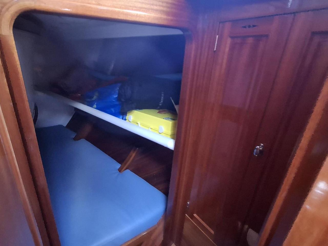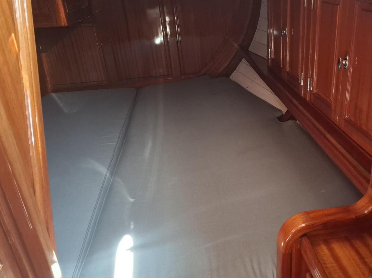 Finition acajou naturel, teck massif, plafond blanc, sellerie bleu-gris, ambiance classique et chaleureuse Une cabine double de propriétaire à l’arrière tribord lit 2,00m X 2,00m Deux salle d’eau avec douche, lavabo et WC électrique avec holding tank de 120L Une cabine double à l’arrière bâbord pour les invités Table à cartes surélevée à tribord Cuisine équipée à bâbord Un carré à tribord face à la cuisine avec table et banquette Coin salon surélevé à l'avant avec vue extérieure Deux cabines simples à l’avant Machine à laver le linge à l’avant bâbord Un pic avant accessible depuis le pont pour l’équipage avec deux couchettes simples Une salle d’eau avec douche, lavabo et WC Réservoir d’eau 2 X 330L Eau chaude et froide sous pression Dessalinisateur