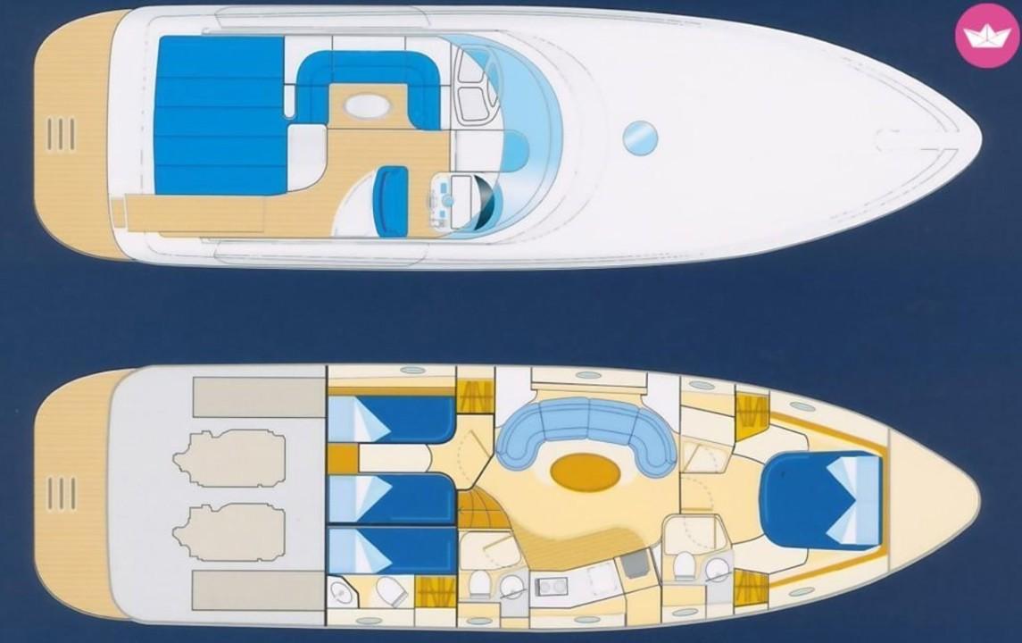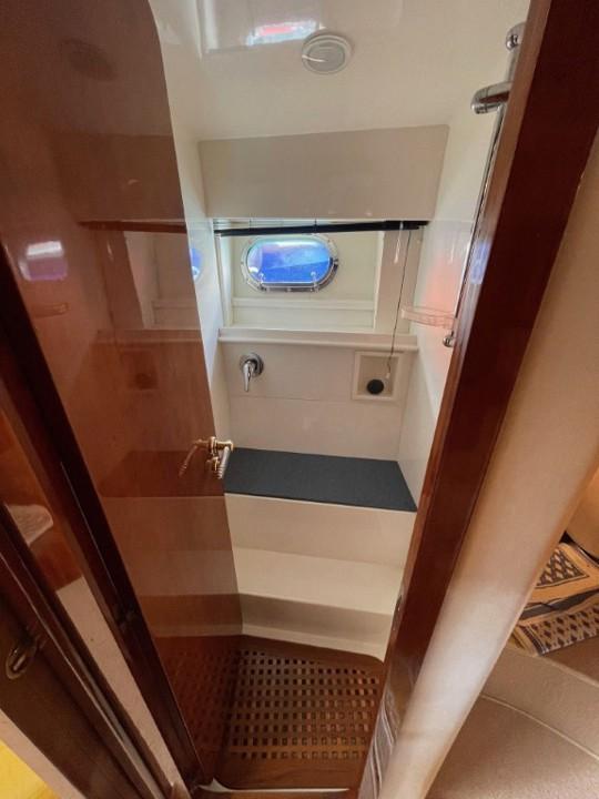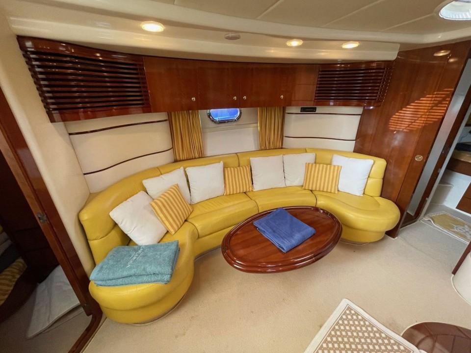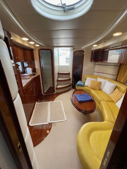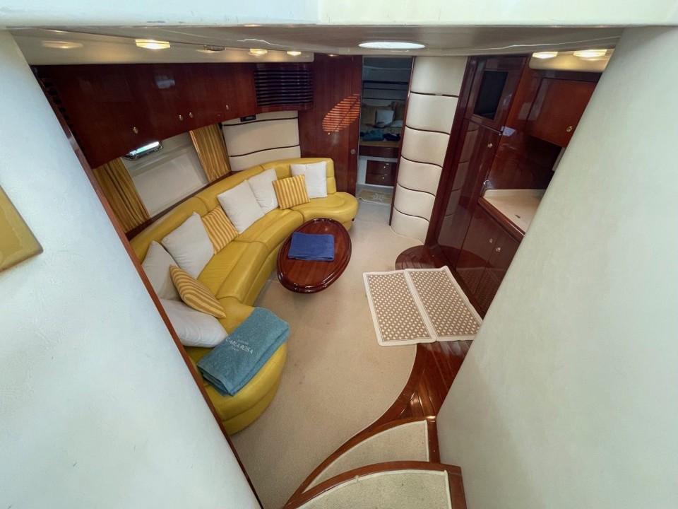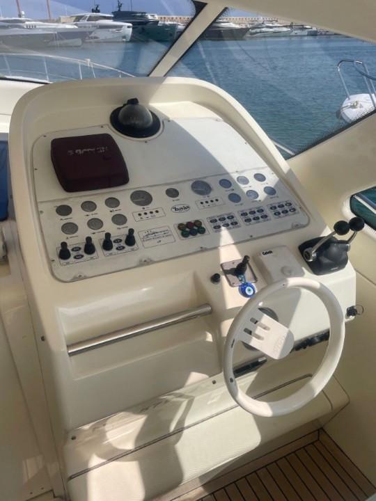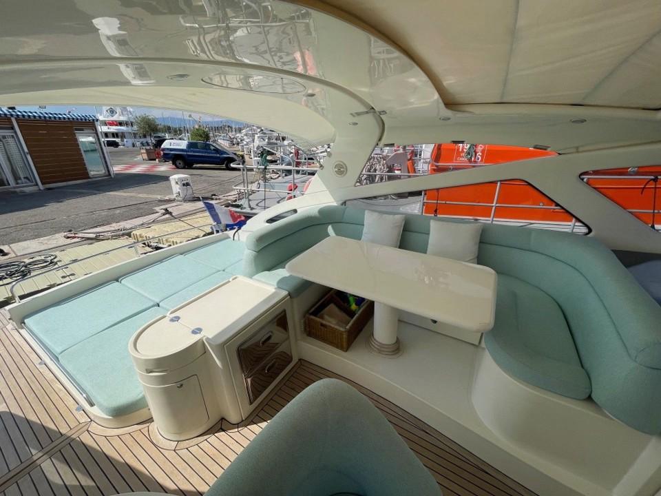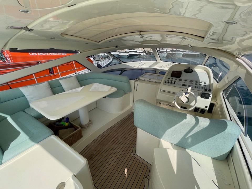 Le cockpit spacieux invite à la détente : bain de soleil, coin repas extérieur et poste de pilotage central protégé par un pare-brise profilé. À l’intérieur, les matériaux nobles et l’agencement intelligent créent une ambiance chaleureuse et contemporaine, idéale pour les croisières en Méditerranée.