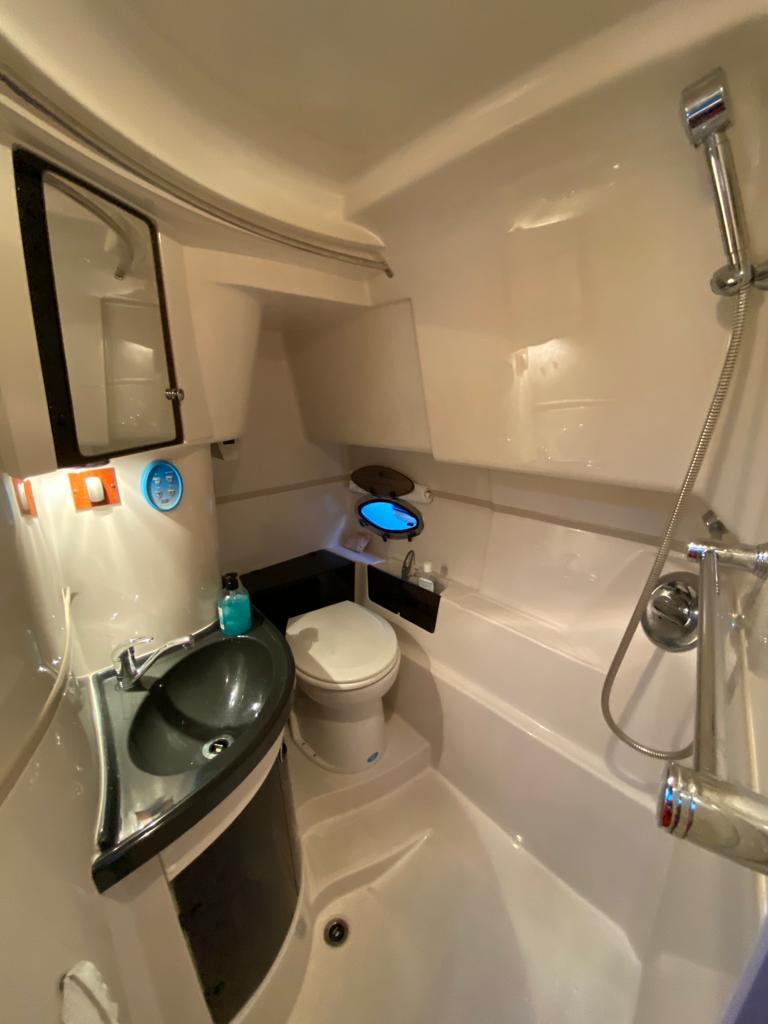 1 salle de bain avec douche, lavabo, WC électrique et rangements